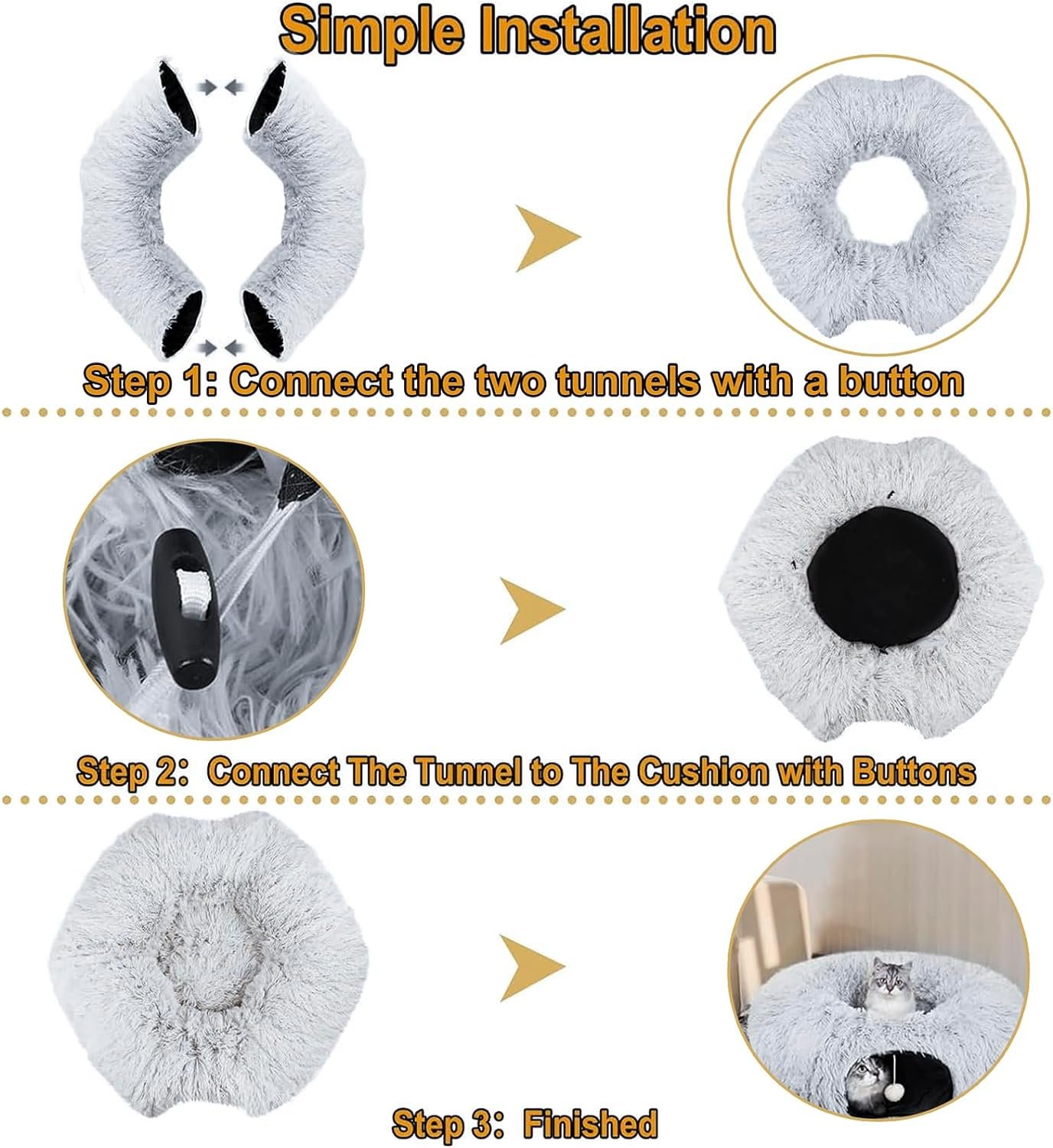 Tunnel cat bed: Our cat can nap,run, hide-and-seek, chase, hunt, and sleep in our simple collapsible tunnel tube. Better fluffy plush material, tunnel length 36″, tunnel diameter 10″.