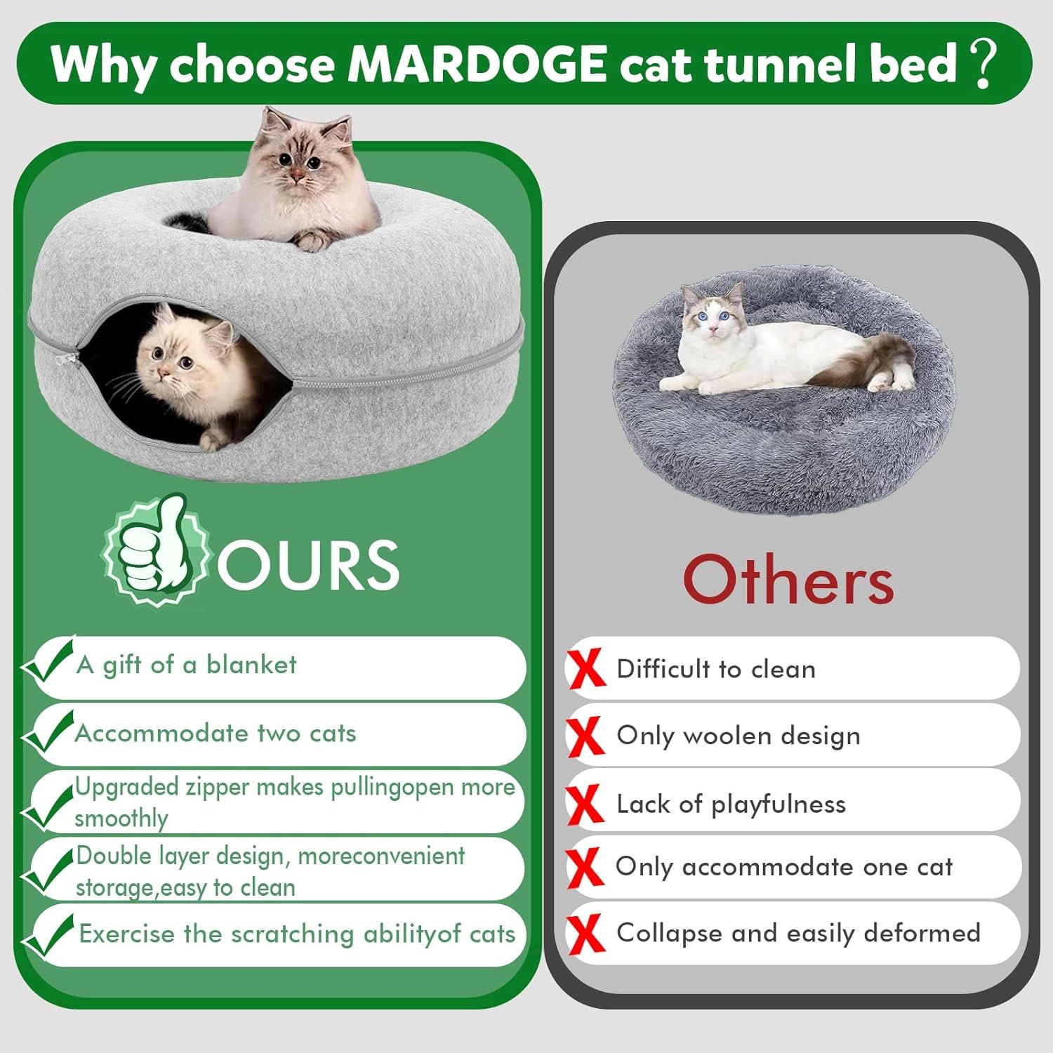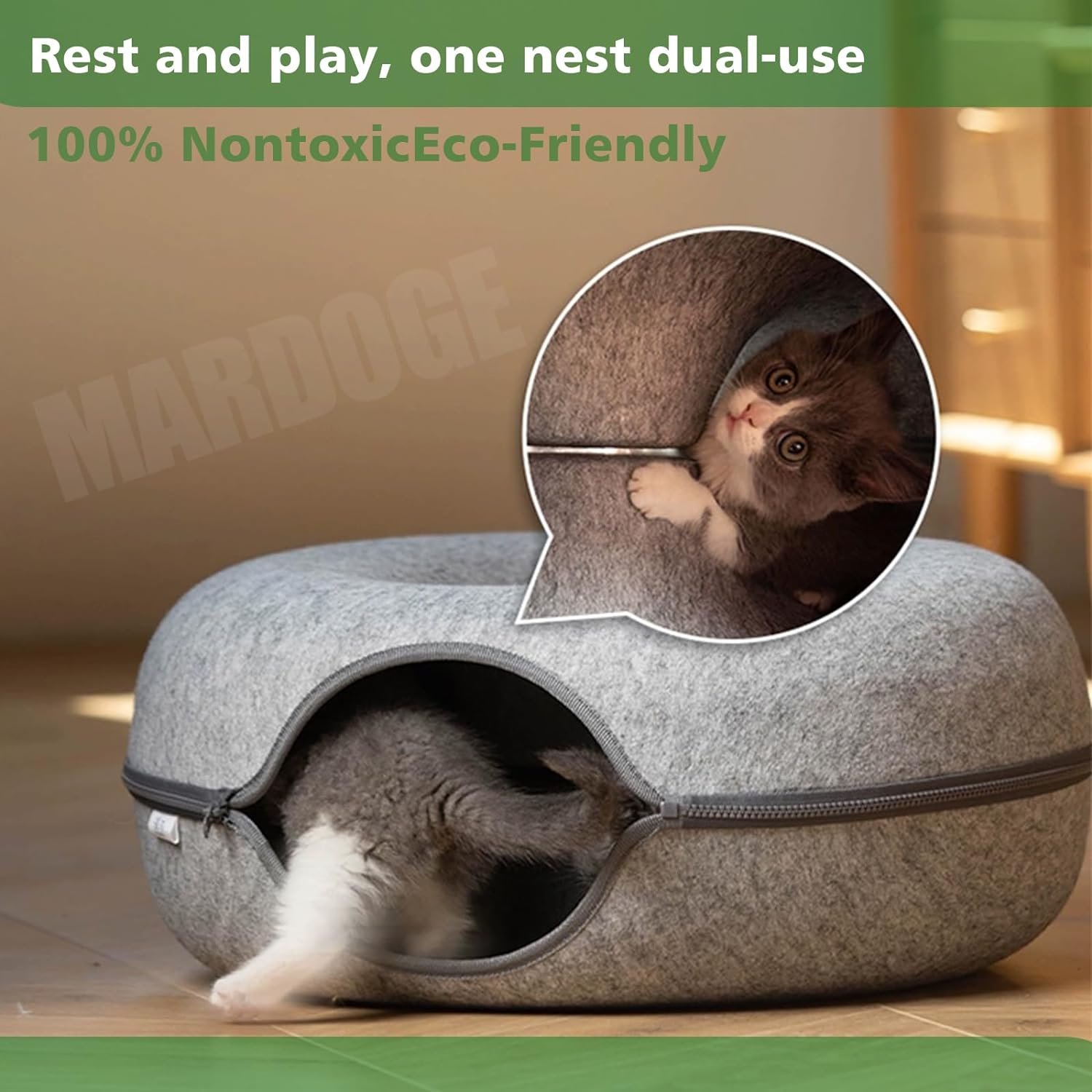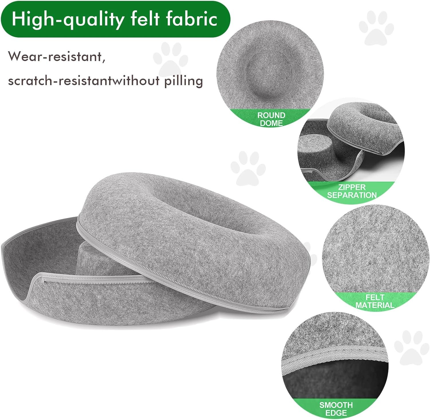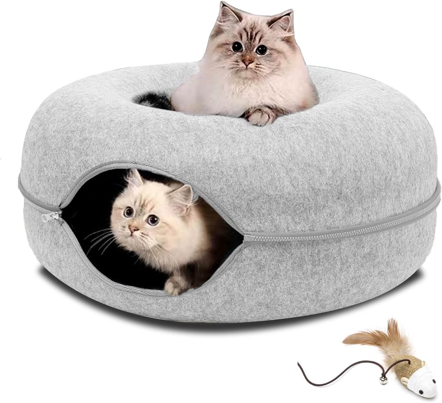 Safe Felt Materials: The cat tunnel bed is made of selected felt material. Non-toxic, dirt, stains, lightweight, soft and durable. The cat tunnel bed for indoor cats consists of only felt and a zipper, which is strong, scratch-resistant, non-pilling. The cat bed can be used in all seasons.