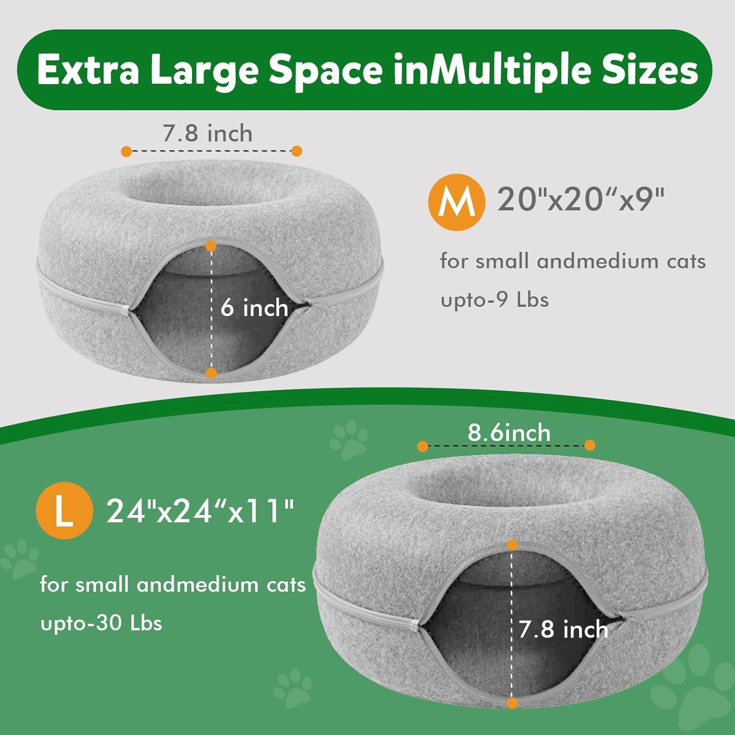 Size Description:The cat tunnel bed L size: 24inx24inx11in for cats up to 22lbs, M size: 20in*20in*8in for cats up to 9lbs. Both sizes come with 1 small cat toys. We always pursue high quality products and the most perfect service, if there is any problem with the product, just click “Contact Us” and we will be happy to help you to replace it or give you a full refund.