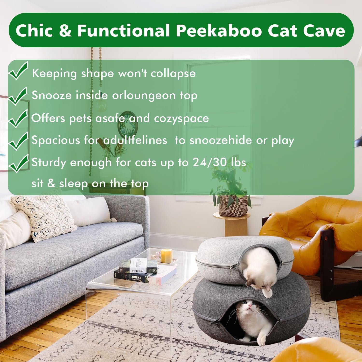 Dual-Function: Peekaboo cat cave adopts Double-layer composite donut/circle design. Donut bed on top, tunnel bed on the bottom. Dual-Purpose cat bed, No Collapse. This unique combination provides interactive play and cozy sleep for your cat. Both for happy play and relaxation and rest for cats, perfect for multiple cats.