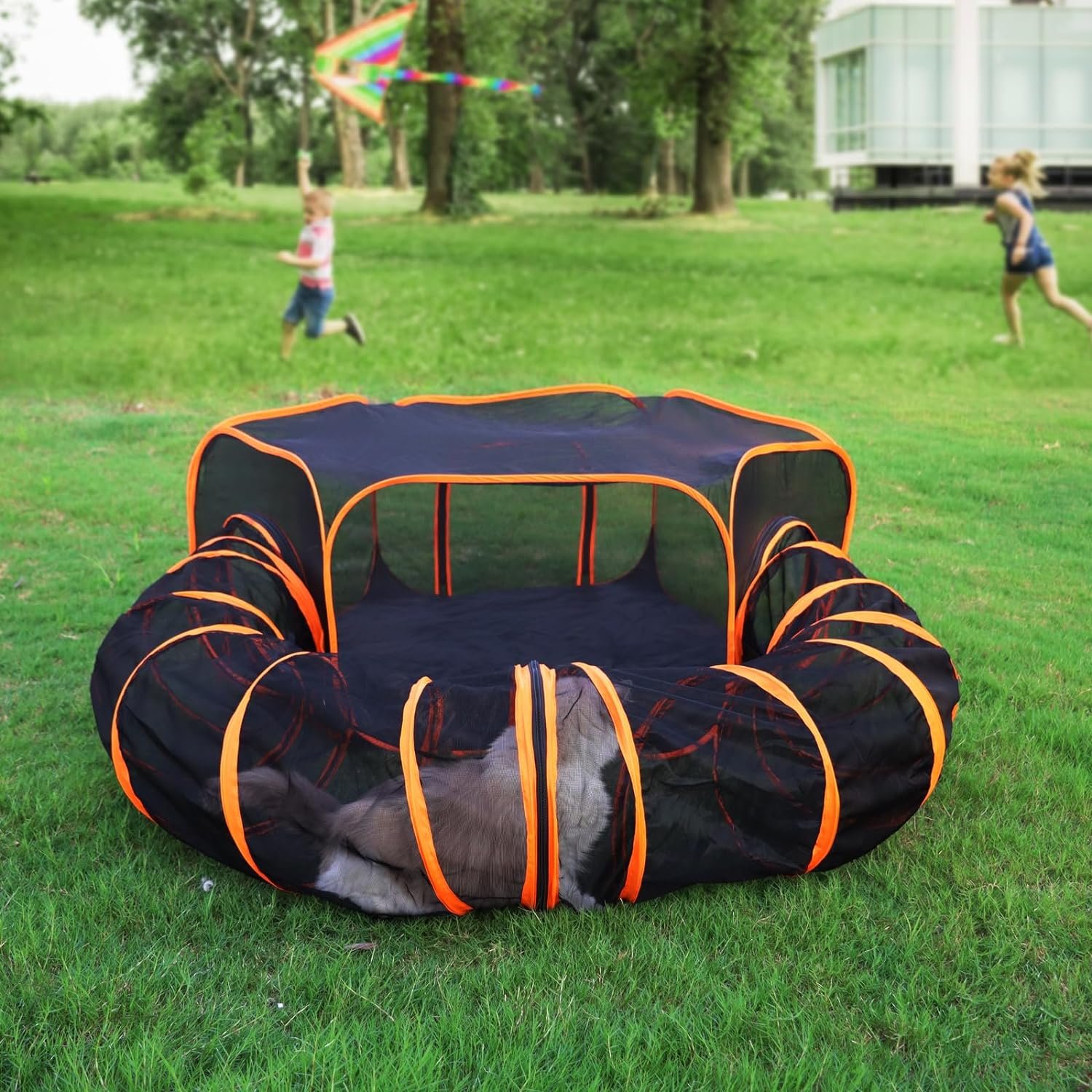 Largr Space for pets——The Tent Dimensions: 47* 47* 18 In, the Tunnel Dimensions:12* 124 In.The animal playpen is suitable for small cats, hedgehogs, hamsters, chinchillas, guinea pigs, moles, squirrels, rabbits, reptiles, or other small animals.