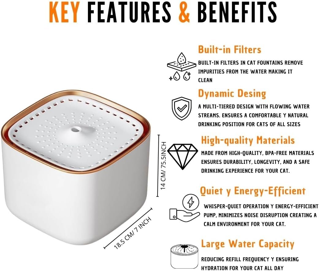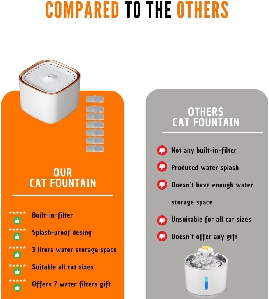 🐱[Encourage Healthy Hydration]: The Cat fountains for drinking running water entices cats to drink more, keeping them hydrated and healthy by having cat water bowl in your pet supplies. The filter system in water fountain cat with water fountain pump and a carbon filter removes impurities, softens water, and keeps it clean and fresh for your feline friend.
