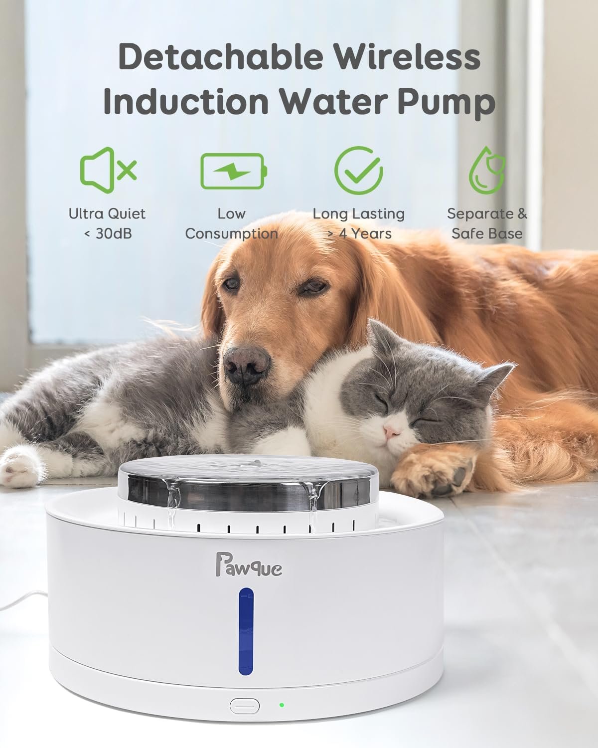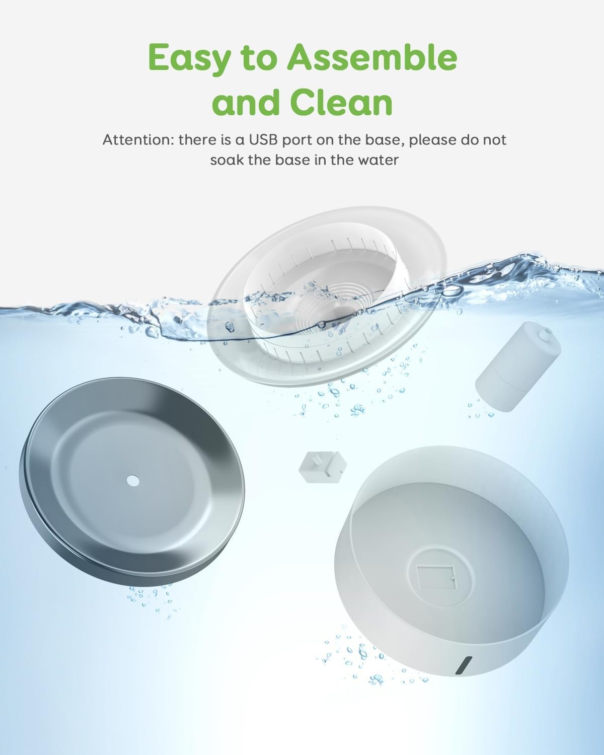 Safe Wireless Water Pump: The stainless steel dog water fountain uses a wireless and ultra-quiet induction water pump, which isolates water from electricity for safe use. The pump operates at a noise level below 30 dB, ensuring a peaceful sleep for you and your pets. All parts of the fountain are detachable and washable for easy maintenance (except for the base).