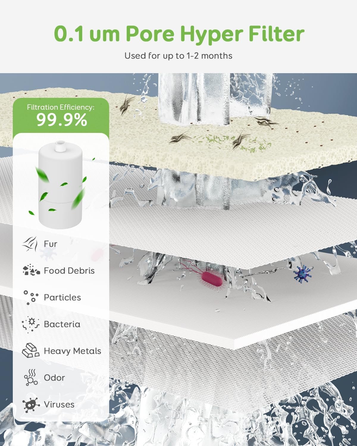 Bubbling Fountain Design & Hyper Filter: Our water fountain for dogs features a bubbling fountain design that satisfies pets’ desire for running water. It also has a 0.1 um fine pore hyper filter that captures food debris and fur. With a filtration efficiency of 99.9%, this automatic cat water fountain ensures your furry friends always have clean and fresh water.