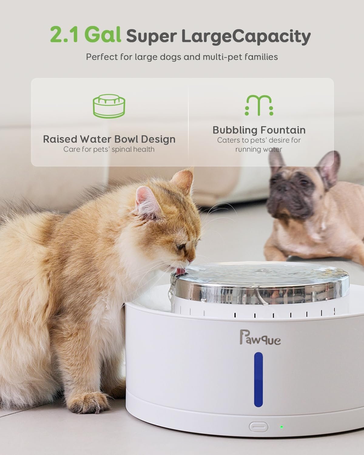 2.1 Gallon Super Large Capacity: The pet water fountain is perfect for all breed dogs and cats, especially large dogs and multi-pet households. It can hold ample water, keeping your pet hydrated. You won’t have to worry about refilling it when traveling or working.