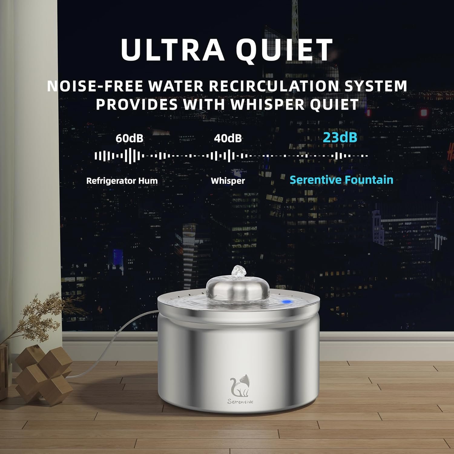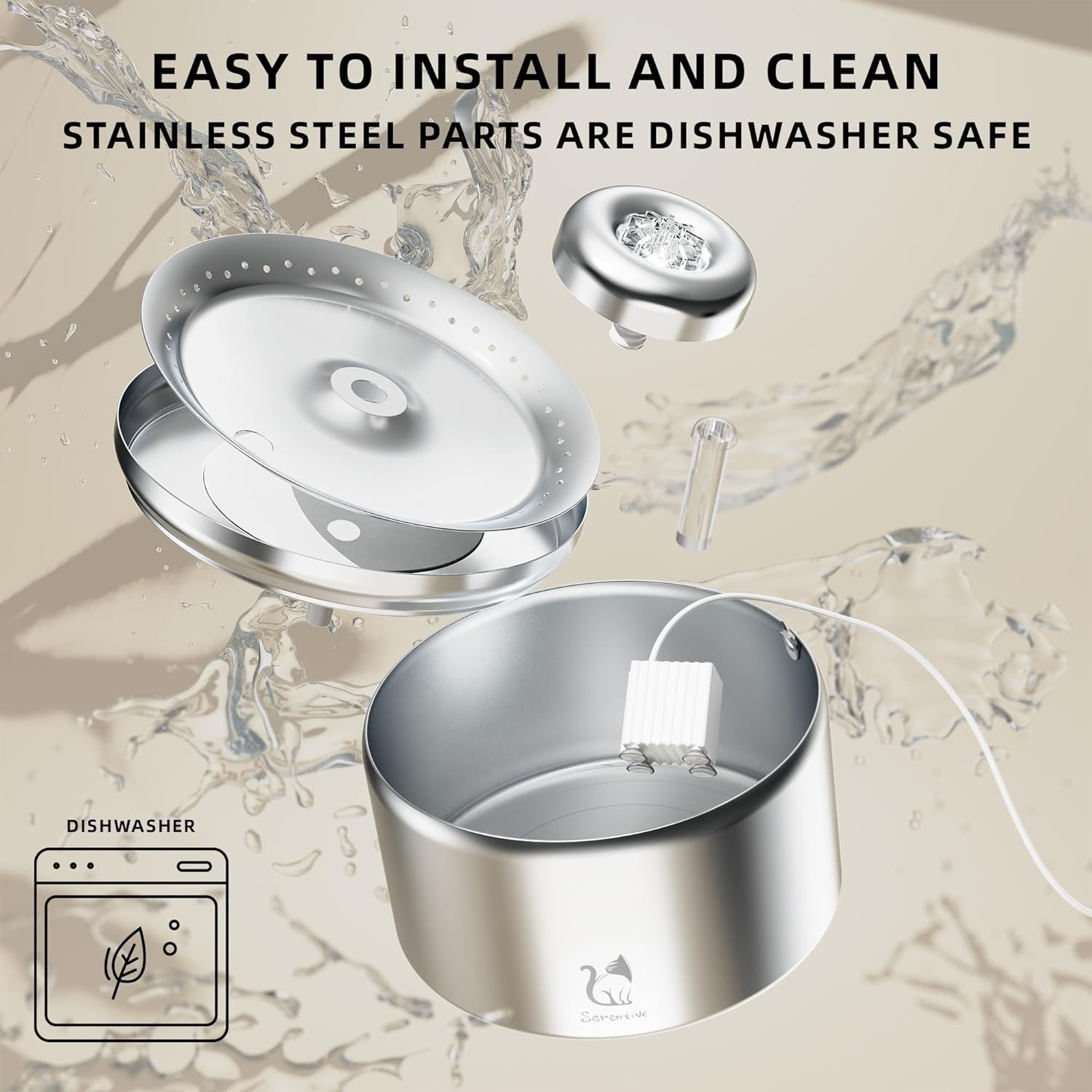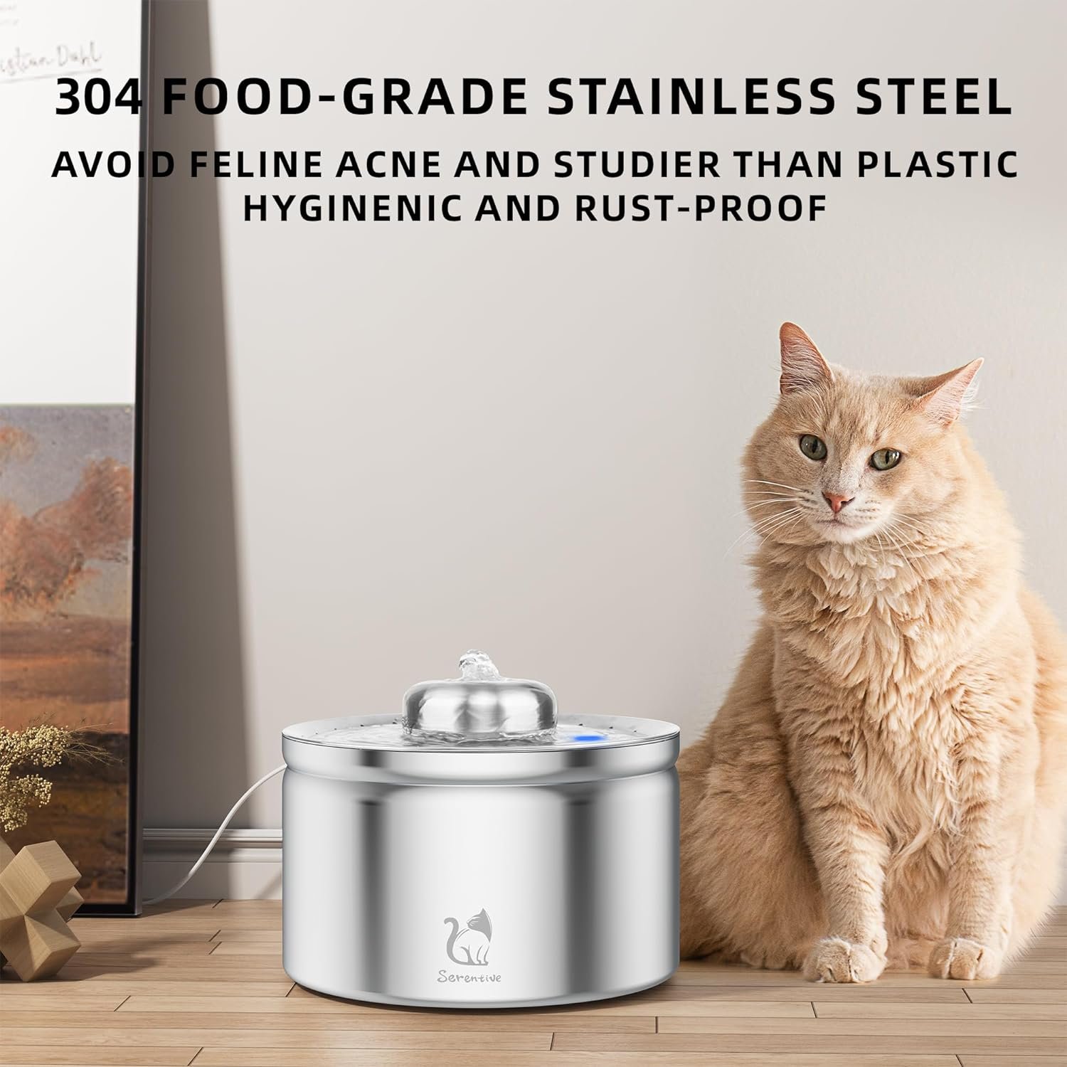 FOOD GRADE MATERIAL & BPA-FREE- Crafted from preium 304 stainless steel, Serentive cat water fountain is not only offering durability and resistance to corrosion but also ensuring your pet’s health is never compromised. Unlike plastic fountains, our pet water fountain maintains a clean, durable and rust-free surface, making it the superior choice for your pet’s hydration requirements.