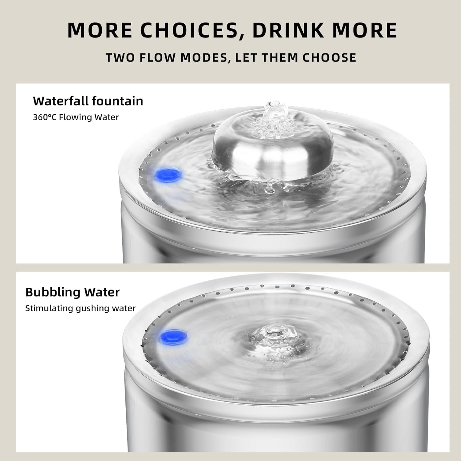 TWO FLOW MODES, MORE HYDRATION- Cat water dispenser equipped with 2 specialized sprinklers for distinct drinking experiences. Swap effortlessly between gushing and waterfall modes to keep your pets intrigued and well-hydrated. Various water flow mode stimulates them to increase their water inateke for better health.