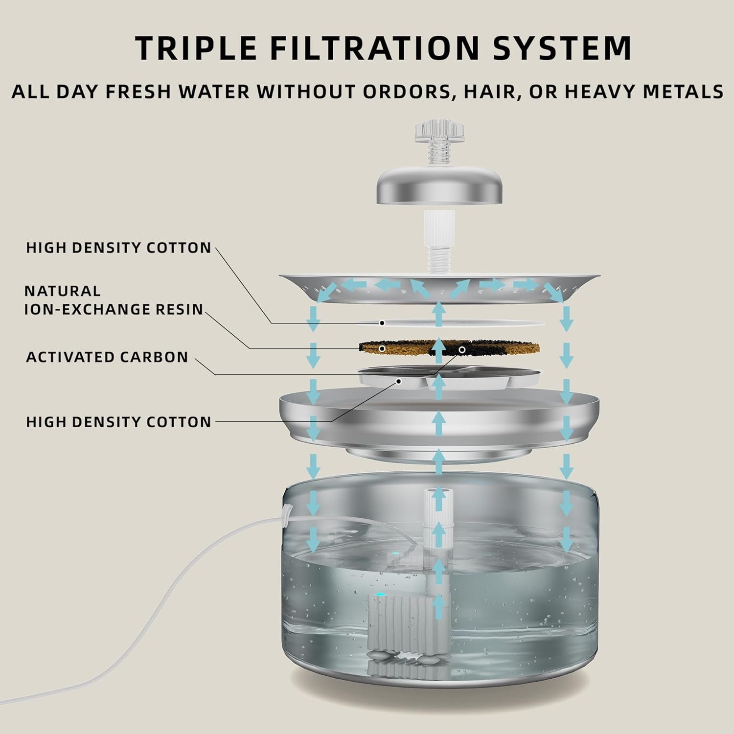 CONTINUOUS WATER PURIFICATION- Ensure your pet’s water is as pure as it is refreshing with advanced multi-stage filtration system cat waterer fountain. The filter core is packed with non-woven fabric, activated carbon, and ion-exchange resin to remove impurities, absorb odors, and soften the water. Metal cat water fountain is coupled with dual-layer stainless steel physical filtration, delivers continuously purified water that tastes great and is healthy for your furry guys.