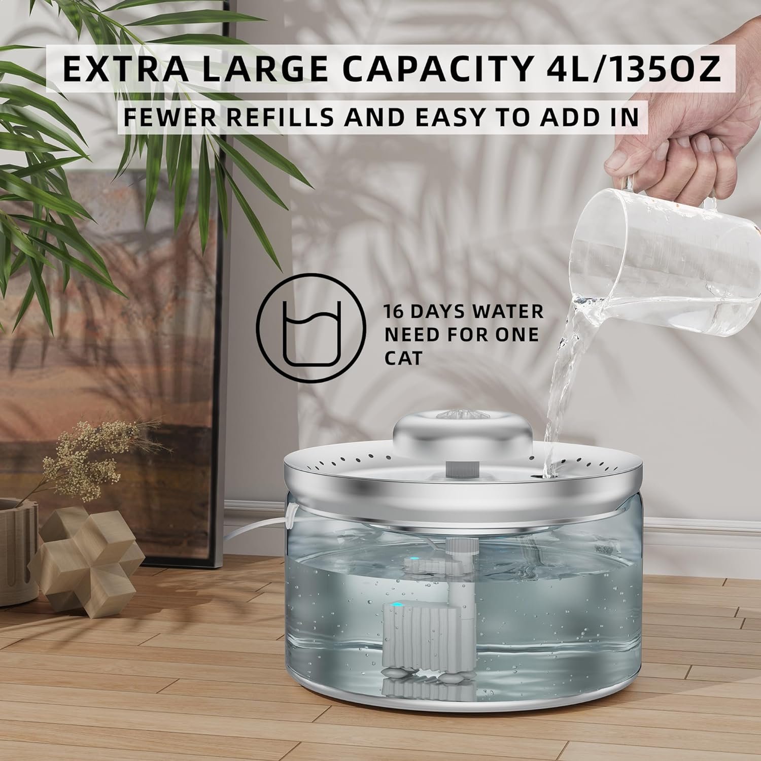 DRINK LONGER, REFILL LESS- Embrace the freedom to travel without pet-care stress! 4L/ 135oz large capacity of pet fountain is specifically designed for multi-pet households, ensuring that your beloved furry friends have ample fresh water whether you’re home or away. Cat drinking fountain is engineered to provide around 16 days for indoor cats.