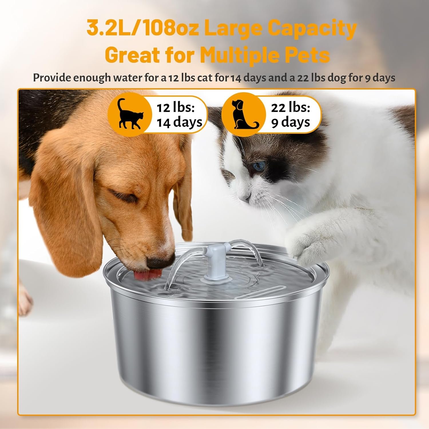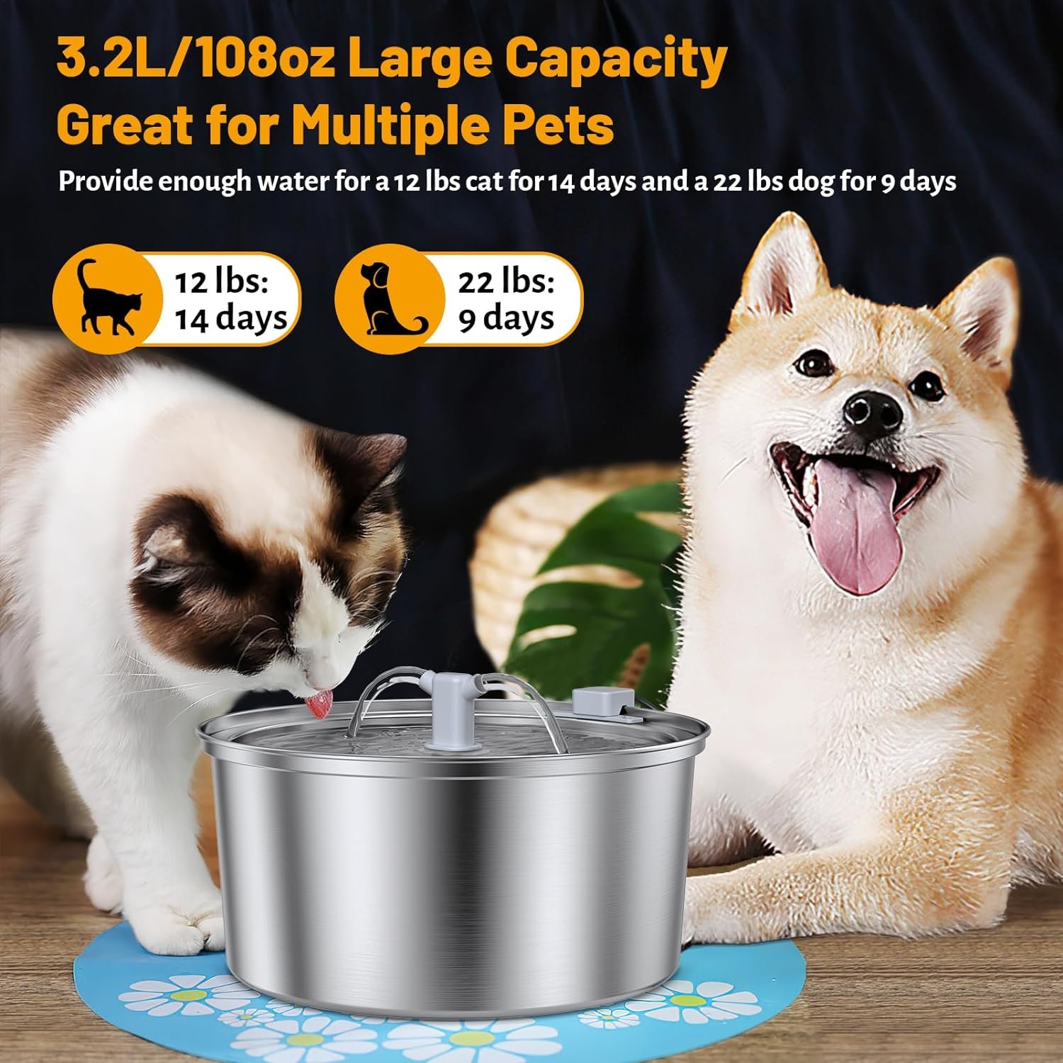 🐾 【LARGE CAPACITY】: Designed for cats and small to medium sized dogs, the 3.2 liter cat water fountain provides enough water for a 12 lb. cat for 14 days and a 22 lb. dog for 9 days, eliminating the need for daily or frequent water refills.