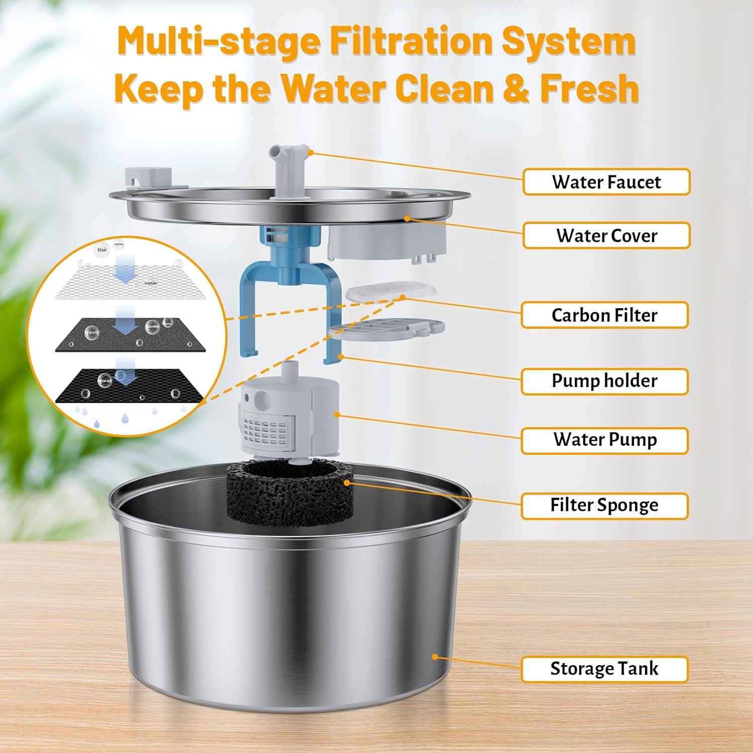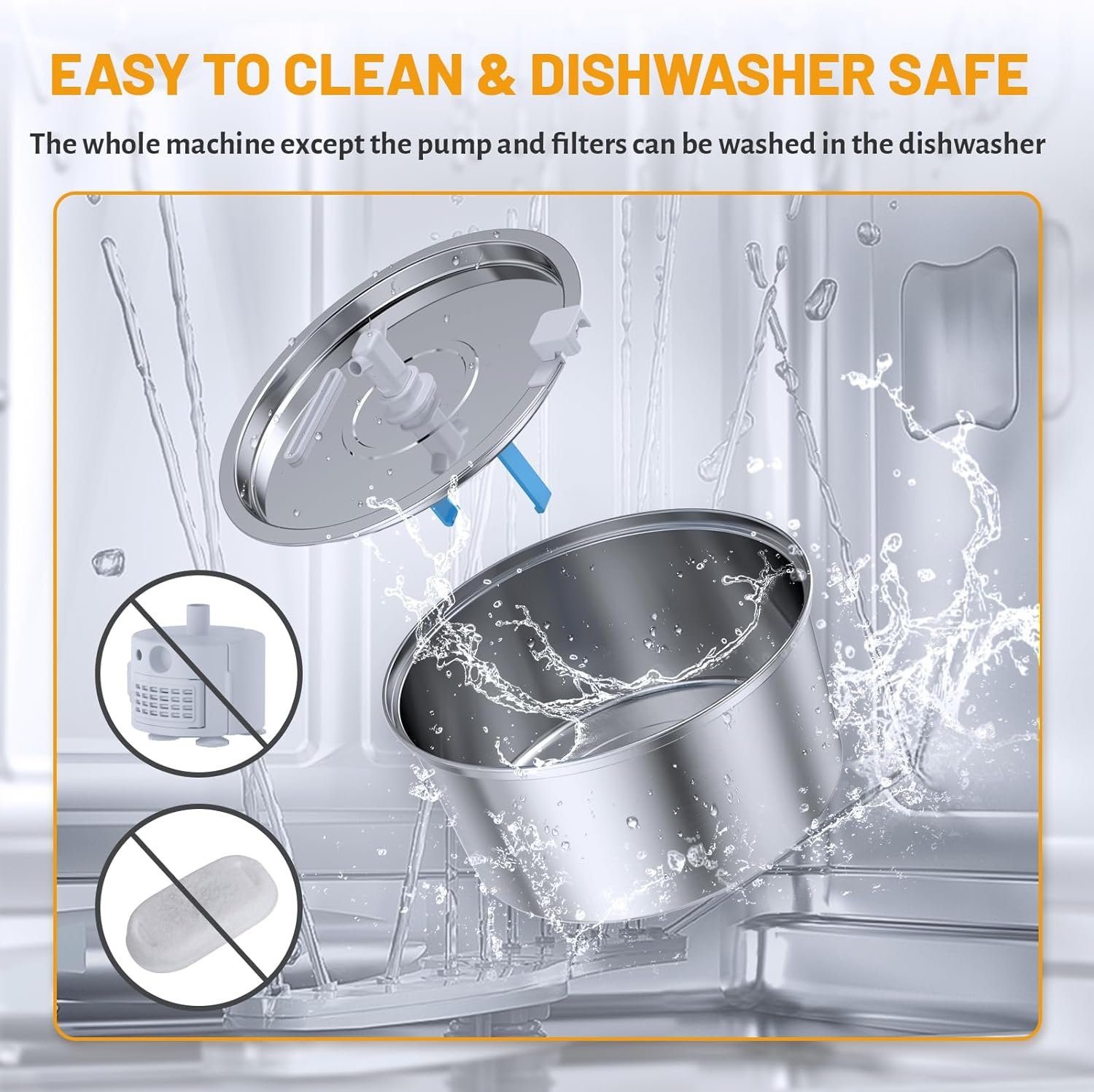 🐾 【EASY TO CLEAN AND DISASSEMBLE】: This cat water fountain is very easy to clean, you can just put it in the dishwasher (REMEMBER the water pump and filter are not included). For your cat’s health, we recommend changing the filter and cleaning the pump and fountain every 2 weeks. And you can spend a few minutes assembling or disassembling the automatic cat water dispenser.