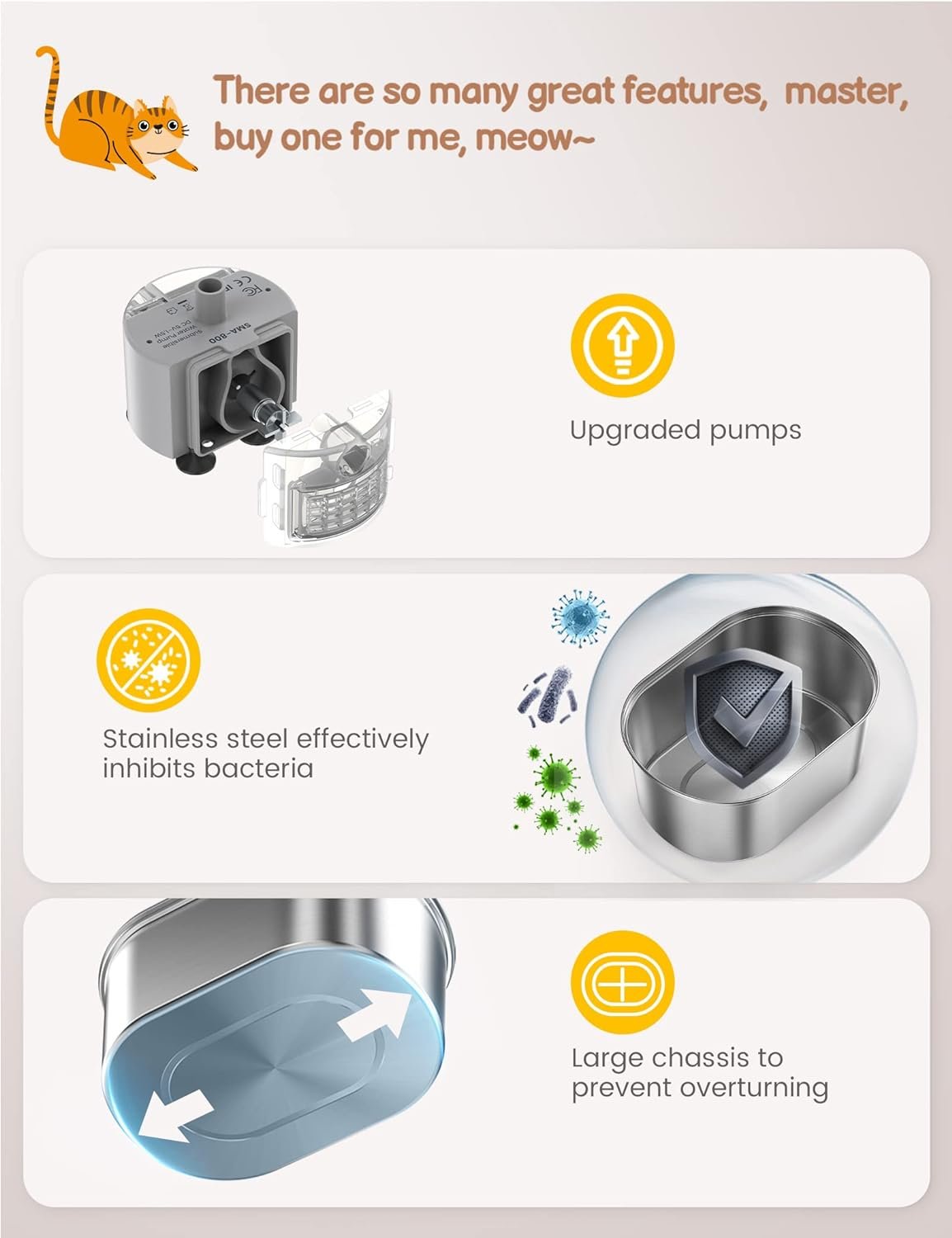 【Sweet Dreams】The pump of this cat fountain is designed with unique motor technology, it is super quiet (less than 35dB) and will not disturb my sleep and mom’s sleep. Low power consumption DC 5V-1.5W, more durable than other pumps! SOOPET brand also offers a 2-year pump warranty, so if there are any problems mommy can contact them for replacement.