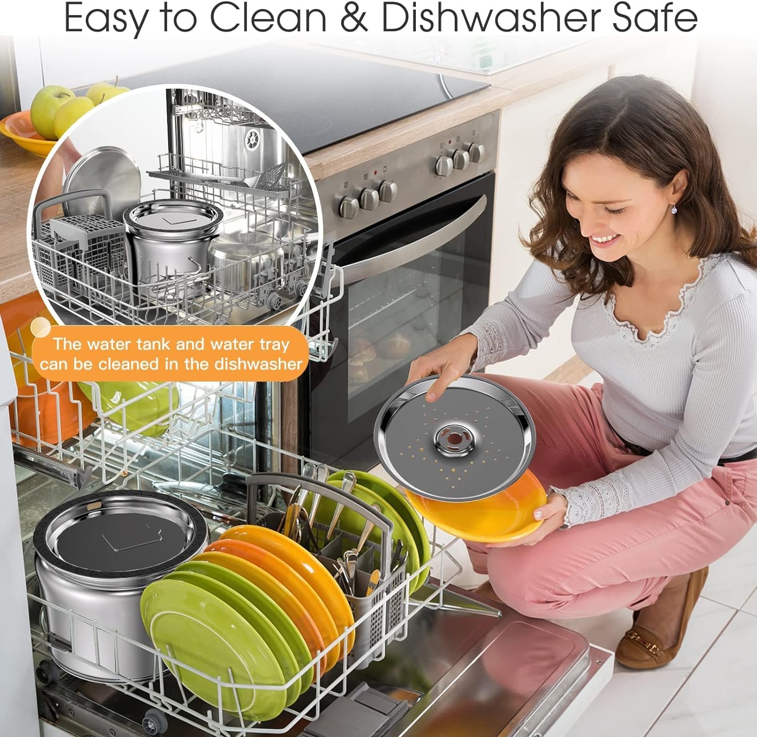 Easy to clean, the stainless steel water tray and tank are dishwasher safe.