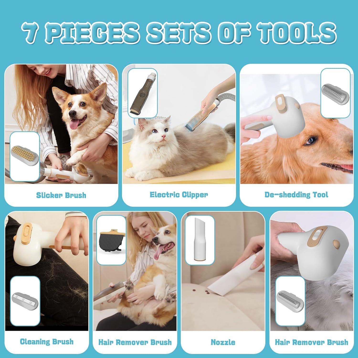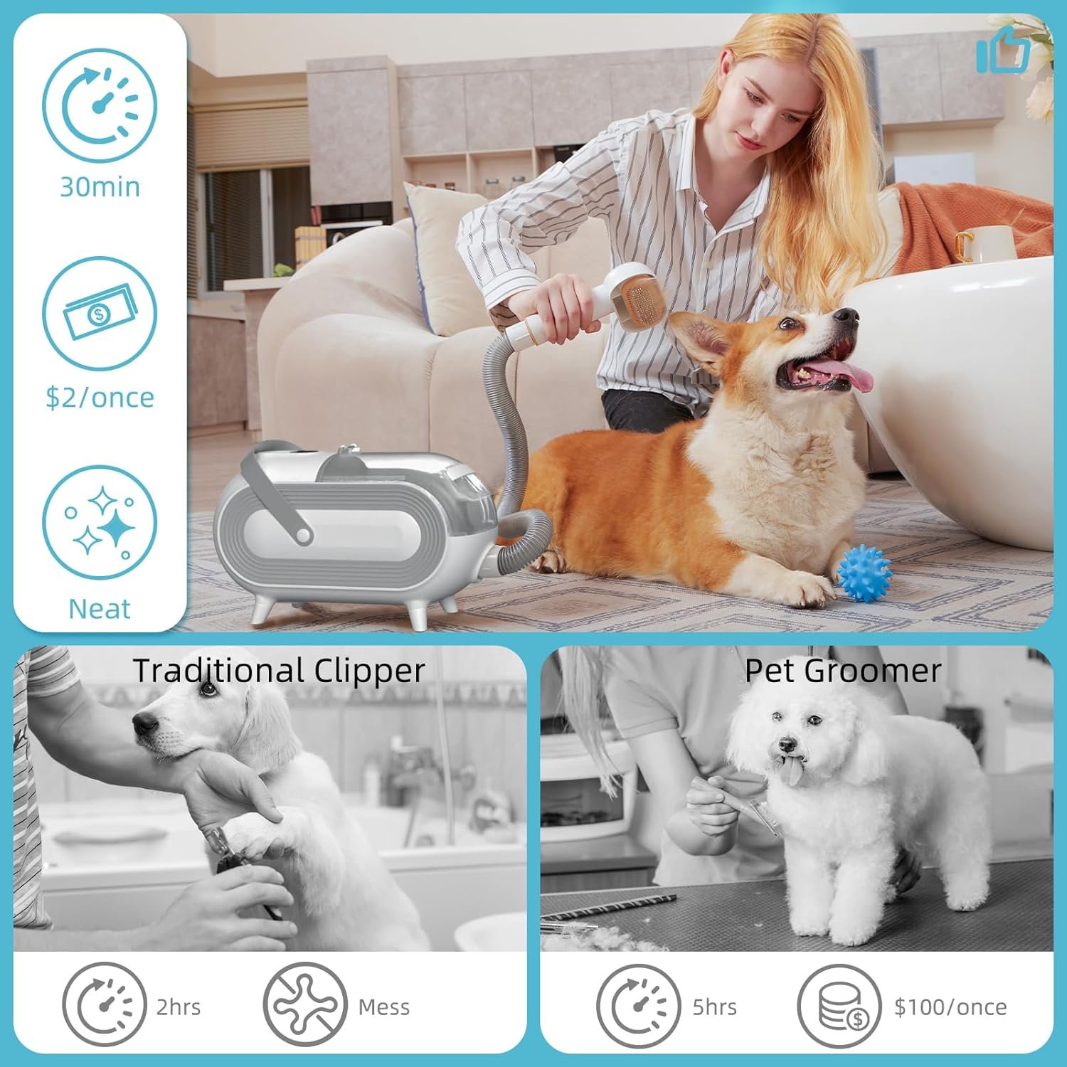 【7-in-1 Professional Grooming Kit】This dog grooming kit vacuum comes with everything you need for a DIY salon day for your dog. You can groom your small dog at home without having to go to a pet grooming salon every month. Start by using the trimmer with 4 electric protective combs for haircutting, then use the deshedding brush to remove loose hair and make your pet’s coat smooth. Finally, the nozzle head and vacuum cleaner can help you clean pet hair from carpets, sofas, and floors.