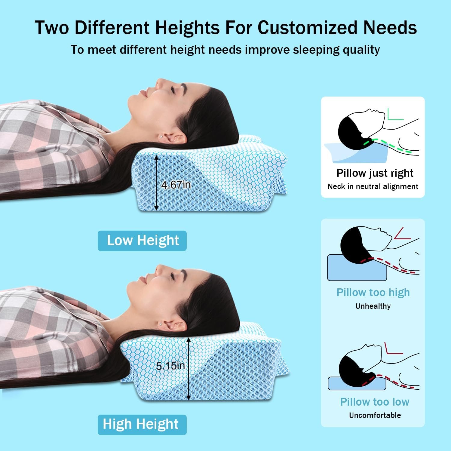 【Custom Height】- Pillow too high or too low? Don’t worry! Our contoured memory foam pillow comes with two height options, so you can choose personalized height. No longer insomnia, snore, stiff neck, cervical pain. It will be the last pillow for neck pain you’ll ever need to buy