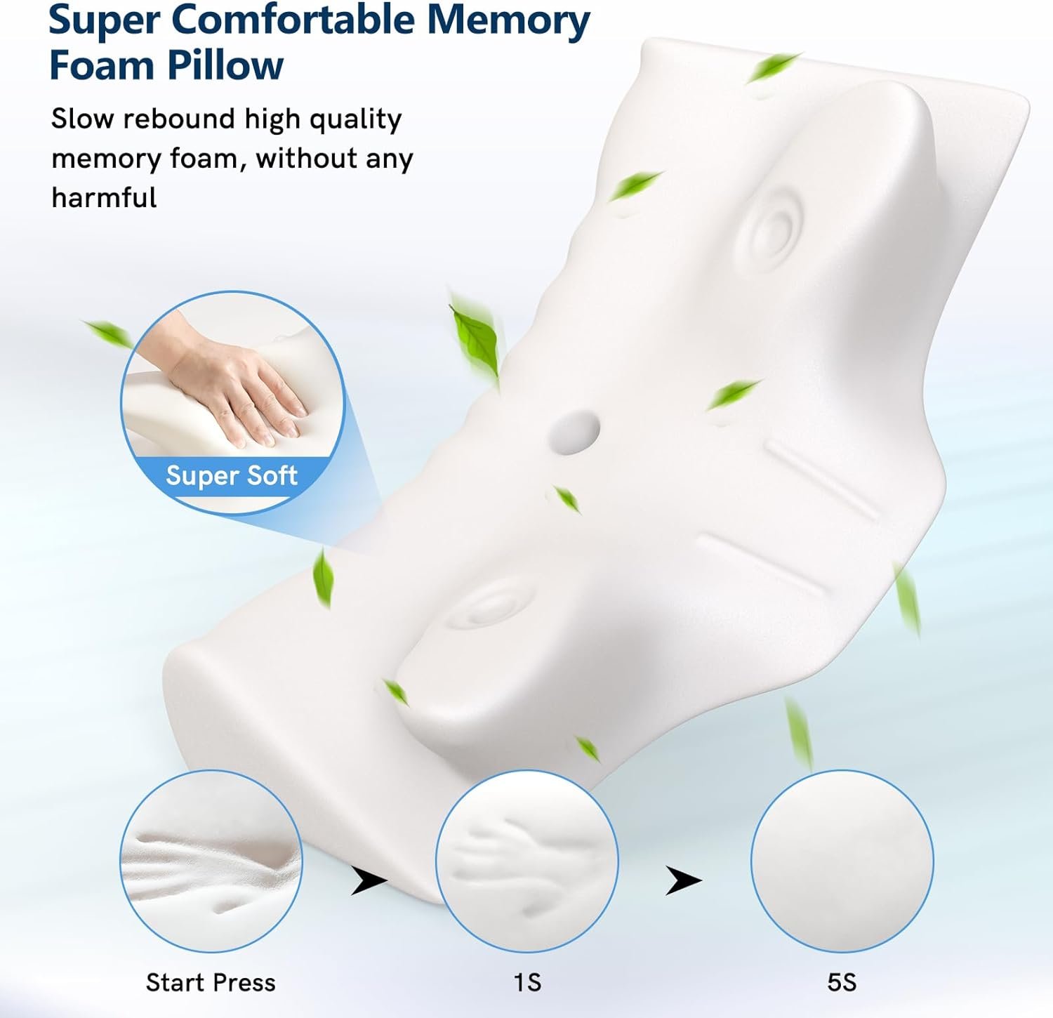 ๐จ๐๐ฆใNo harmful substances! Memory foam pillow made of 100% high-density space memory foam material,which provides amazing comfort and soft yet sturdy support for sleep, and greatly ease your head, neck, shoulder and back muscle. With the feature of rebounding within 4-6 seconds, the contour orthopedic pillow will not become flat, lose its shape or density after long-term use.