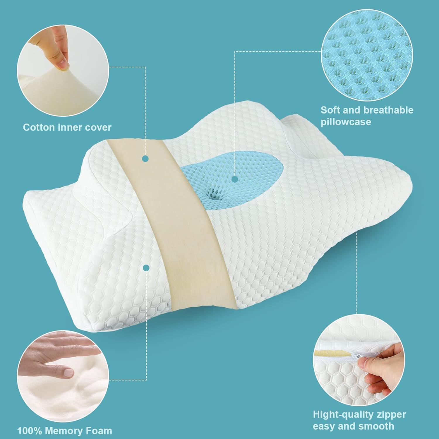 💎【𝐒𝐥𝐨𝐰 𝐑𝐞𝐛𝐨𝐮𝐧𝐝&𝐑𝐞𝐦𝐨𝐯𝐚𝐛𝐥𝐞 𝐁𝐫𝐞𝐚𝐭𝐡𝐚𝐛𝐥𝐞 𝐏𝐢𝐥𝐥𝐨𝐰】Crafted with high-quality CertiPUR-US& OEKO-TEX certified memory foam, it offers a unique slow-rebound feature that provides firm support. The 3D mesh pillowcases and open-cell memory foam facilitate optimal breathable dissipation, offering you a cool and refreshing night’s sleep. Our cervical neck pillow is removable with a zipper and machine washable,so you can always keep your pillowcase clean and smelling fresh.