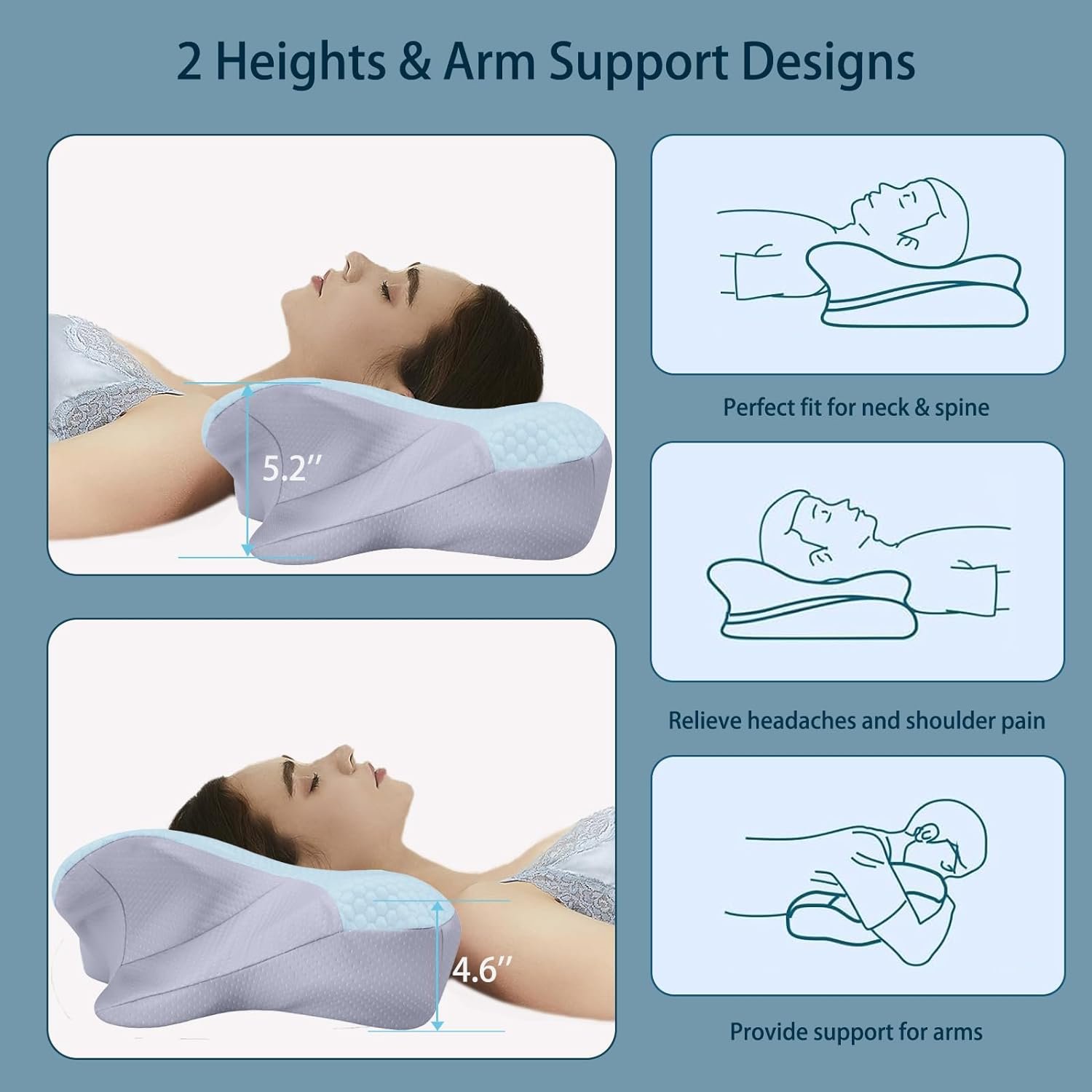 【2 Heights & Arm Support Designs】: Our cooling memory foam pillow comes two height options with size 24.8*14.5*5.1/4.5 inch ( L x W x H). And contour pillows specific grooves to support your arms for a comfortable sleep. This orthopedic pillow is suitable for all kinds of sleeping posture,such as stomach ,back ,side sleeping.