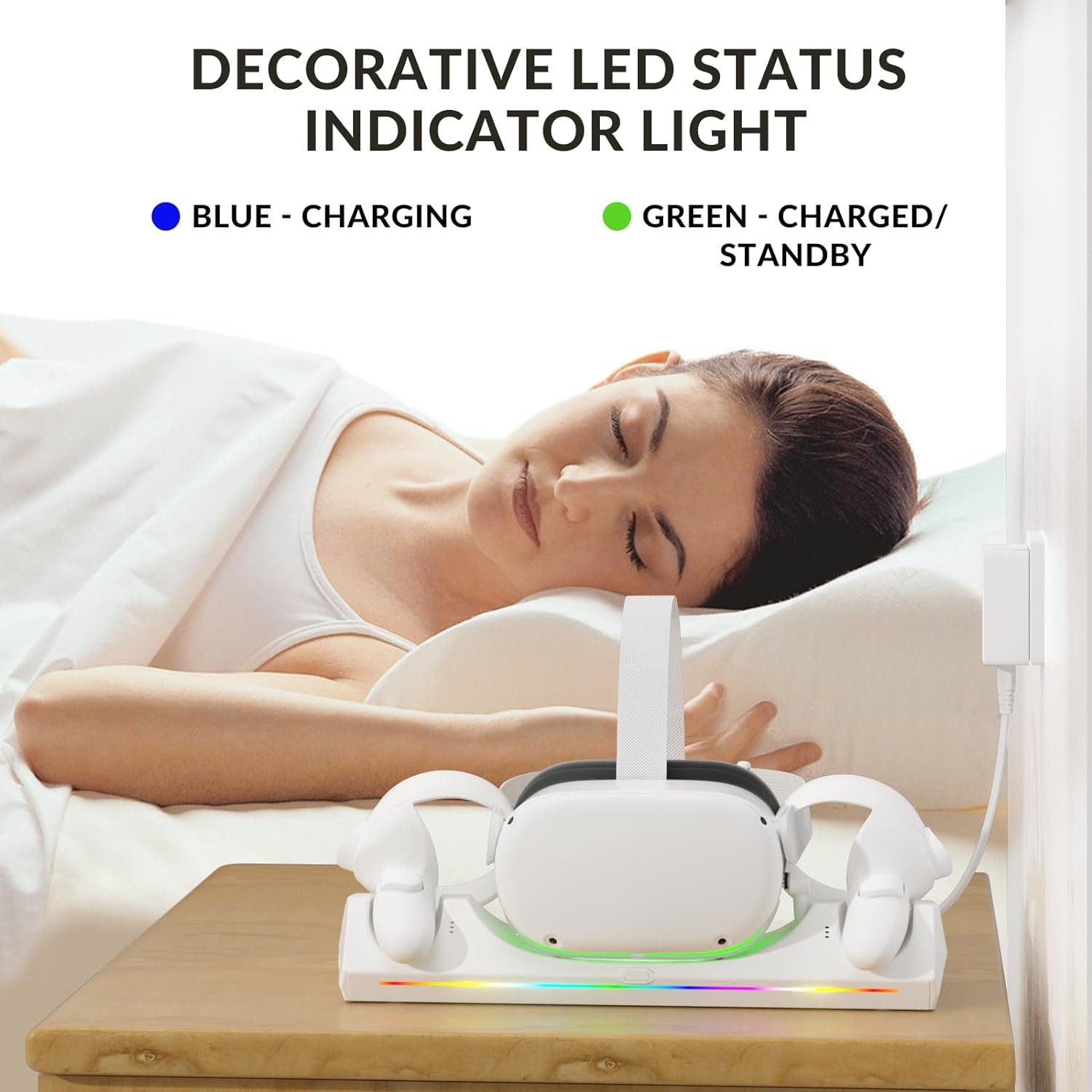LED Indicators and Easy Sleep Function: We have designed LED lights on our VR Charging Dock to indicate the charging status of the headset and touch controllers. The dock is blue when charging and turns green when fully charged. Additionally, we have included an adjustment button in the middle that allows you to easily turn off the indicator lights.