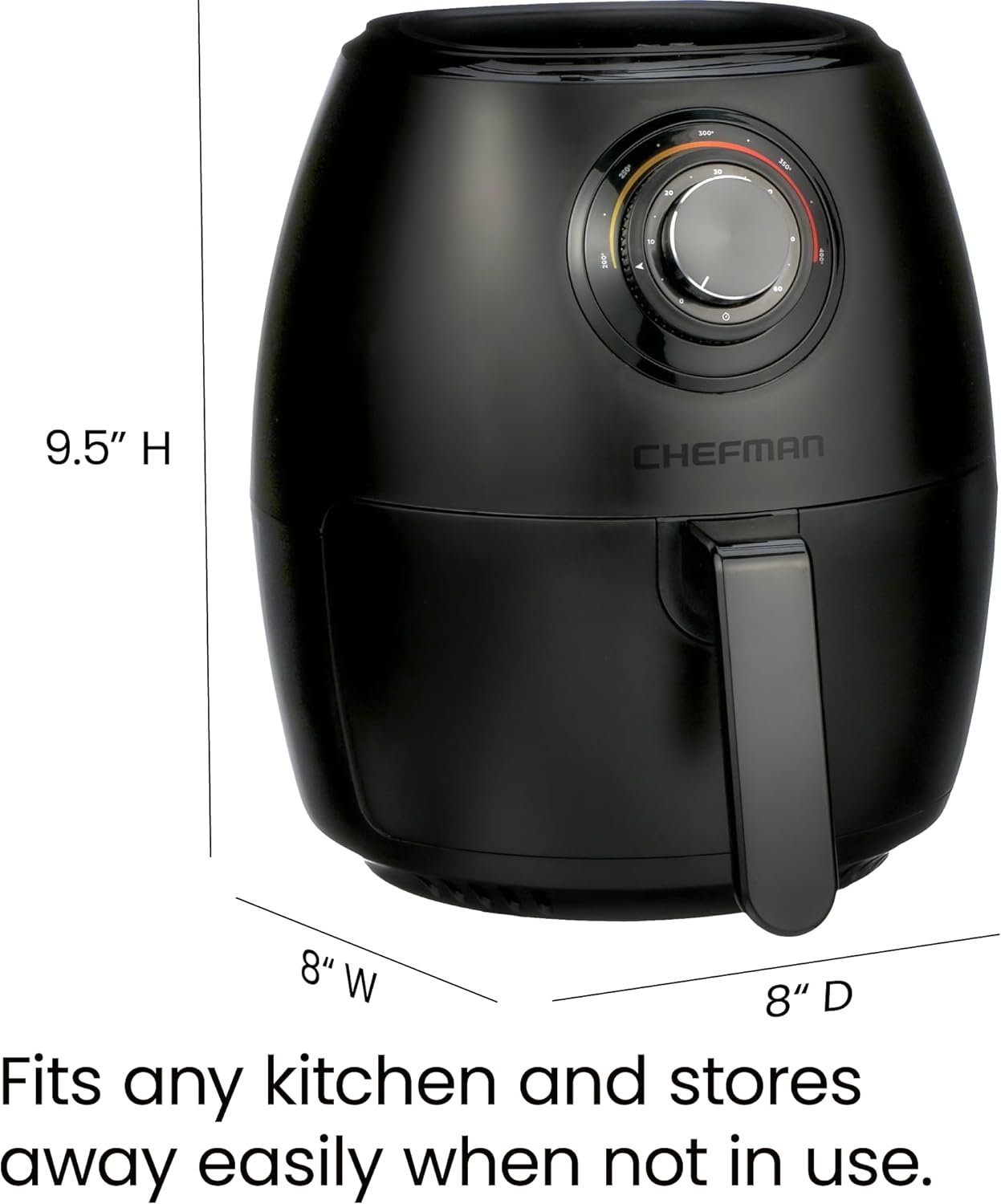 Black : Achieve the deep-fried flavor you love, without all the oil and added calories. The Chefman TurboFry™ Air Fryer allows you to bake, fry and roast like a pro. This airfryer requires little to no oil, so there’s less of that fried oil smell lingering in the house and less fat that you’re consuming. It’s large Black capacity and flat basket gives you the ability to cook enough for a hungry crowd all at once. Skip the microwave! Reheat soggy leftovers in the air fryer to return them to their original texture. Make better-for-you fries that are just as crispy and tasty, roast chicken thighs, or heat up leftovers for a quick and easy meal. The temperature control with 60-minute timer automatically shuts off once food is done, so you never have to worry about burning or drying out your food. Its space saving basket is removable and dishwasher safe for easy clean-up, so you’ll have more time to dream up your next air-fried meal!