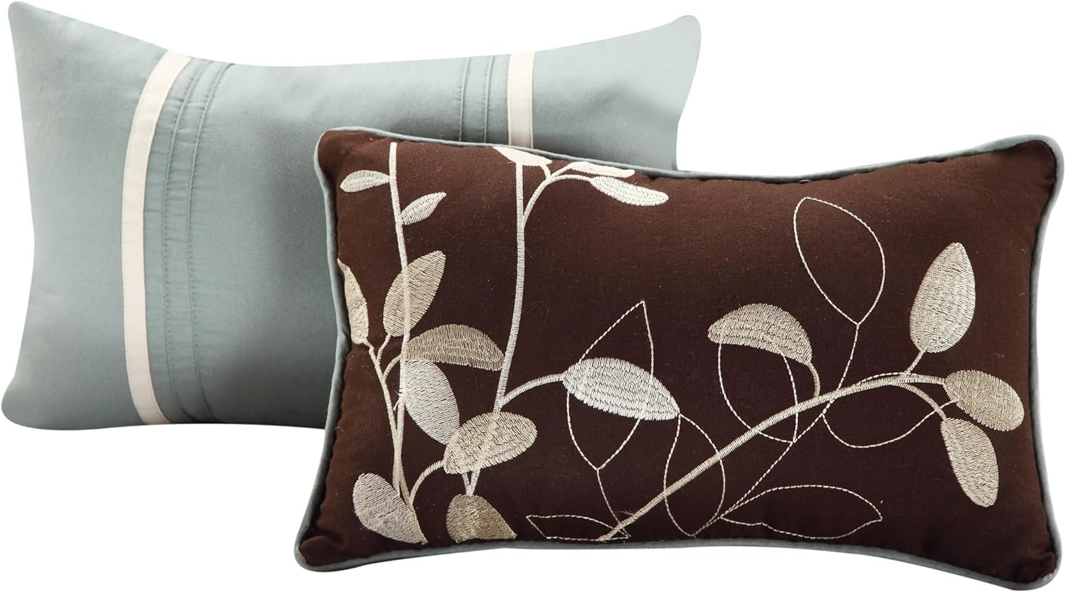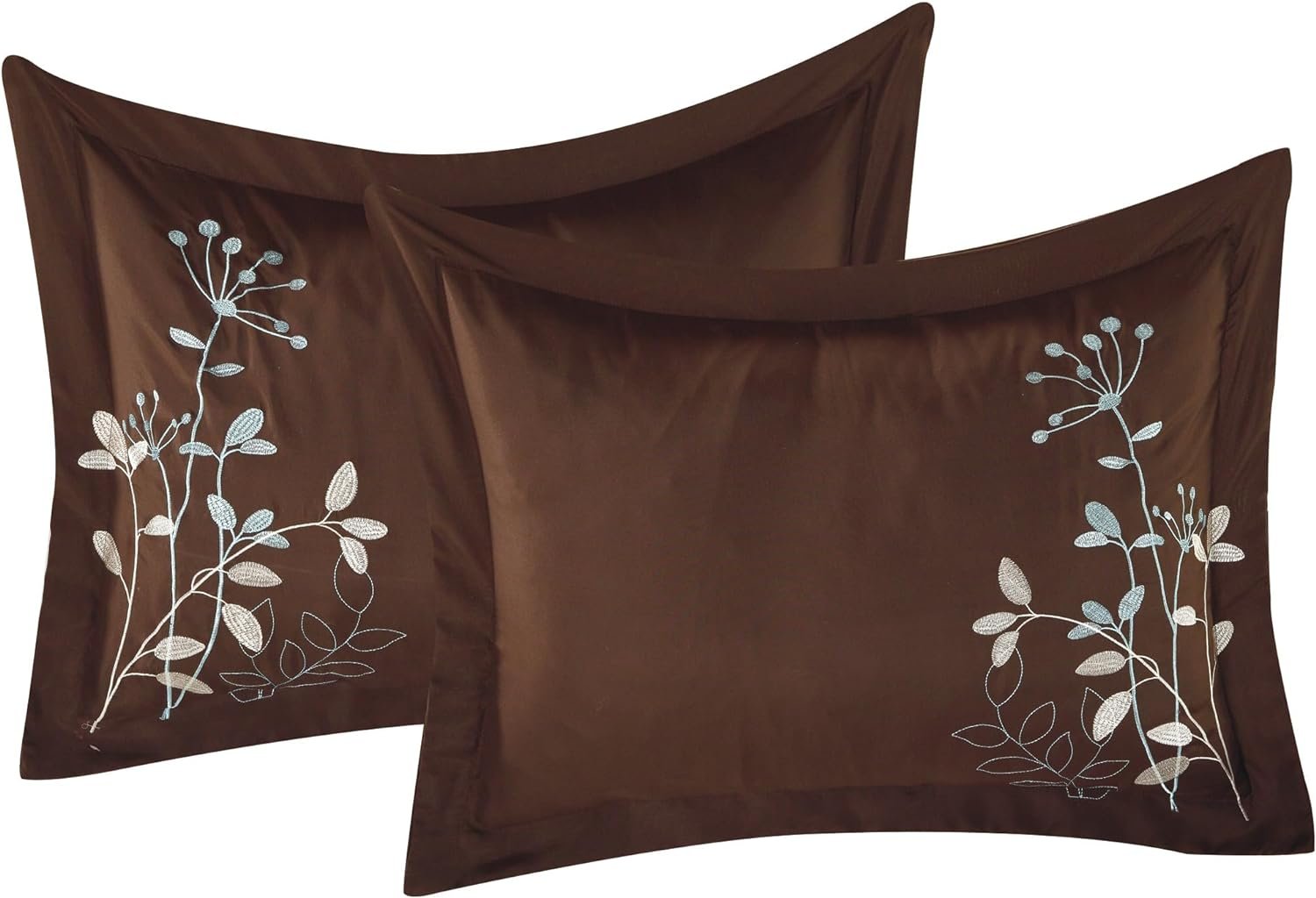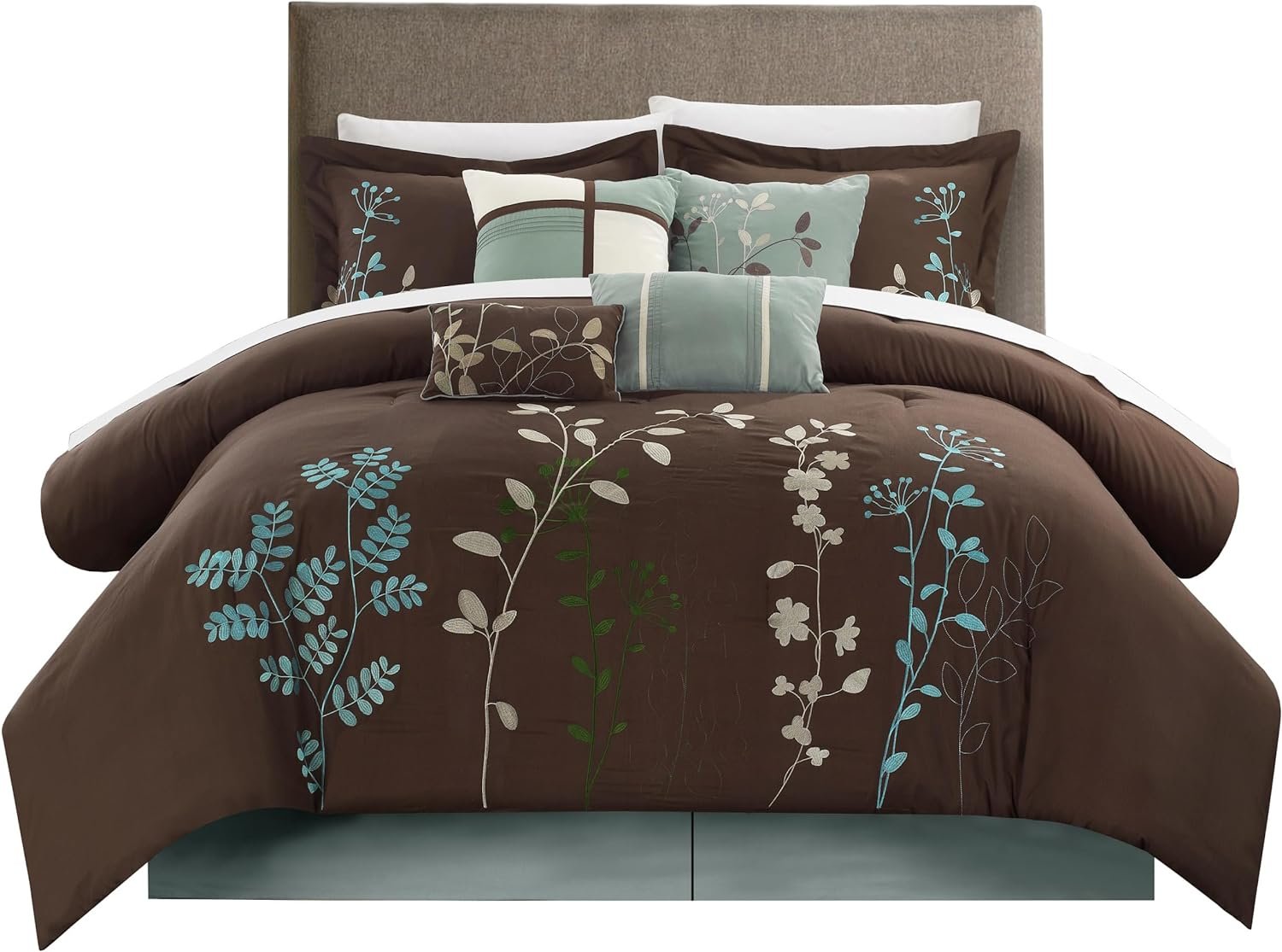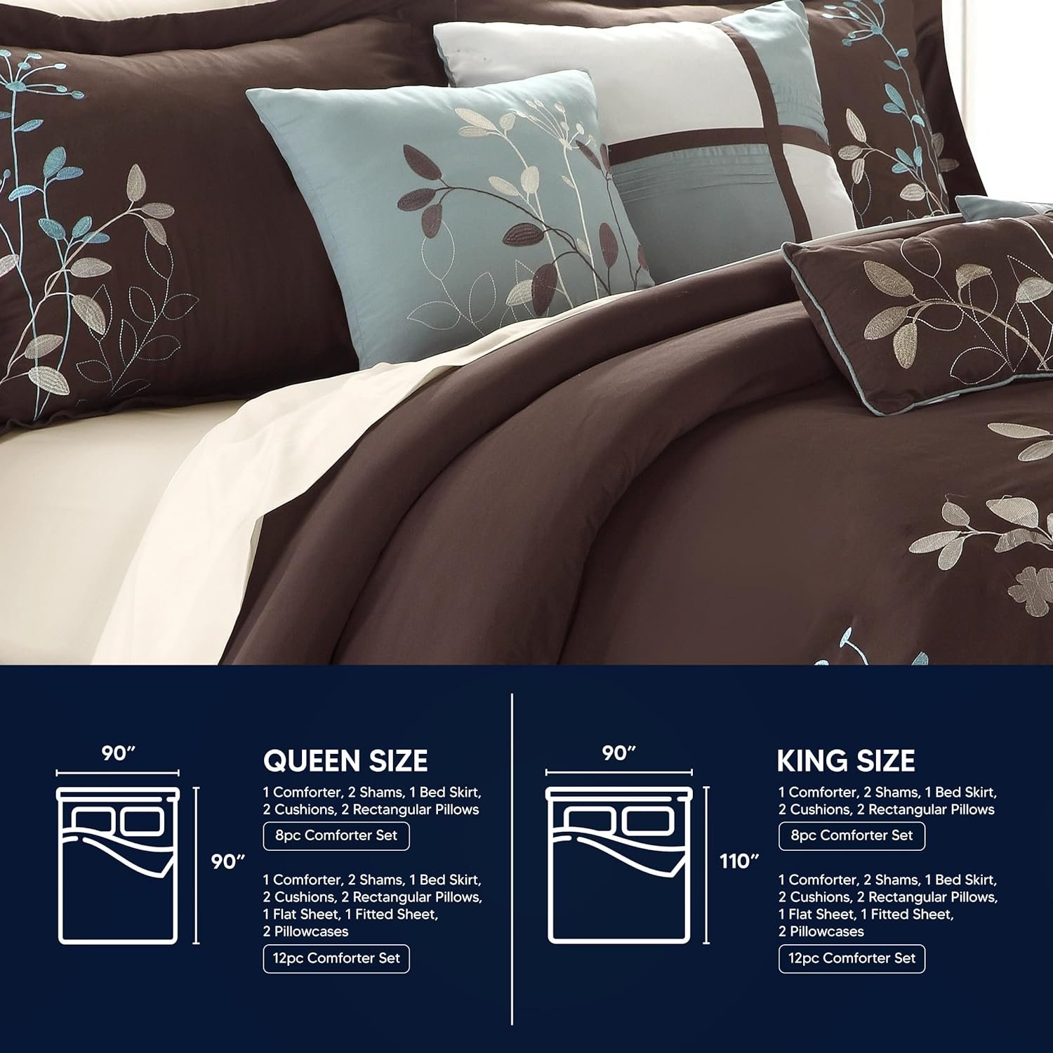 OVERSIZED AND OVERFILLED. This 8-piece lavish comforter set comes with everything you need to do a complete makeover for your master or guest suite. Detail Embroidery highlight the true essence of look you are trying to achieve in elegant home decor. Outer material is made from 100% polyester. Fill material is made from 100 GSM brushed microfiber, which is a soft plush fabric comparable to 200TC cotton. Set includes: 1 comforter (Queen=90×90″/King=110×90″), 1 bed skirt (Queen=60×80+14″/King=78×80+14″), 2 shams (Queen=20×26+2″/King=20×36+2″), 2 filled square cushions 18×18″, 1 cushion 12×18″, 1 breakfast pillow 9×12″. Care Instructions: Machine wash cold on gentle cycle. Do not bleach or dry clean. Tumble dry low. Light iron as needed.