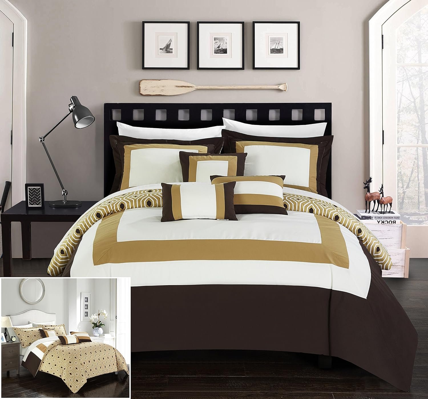 Recreate the luxurious experience found in a 5-star hotel in your bedroom. Minimalist hotel design reverses into a contemporary geometric pattern print for two looks in one. Embellished deco pillows, reversible shams and color coordinated super soft microfiber sheets are included to a complete the look.