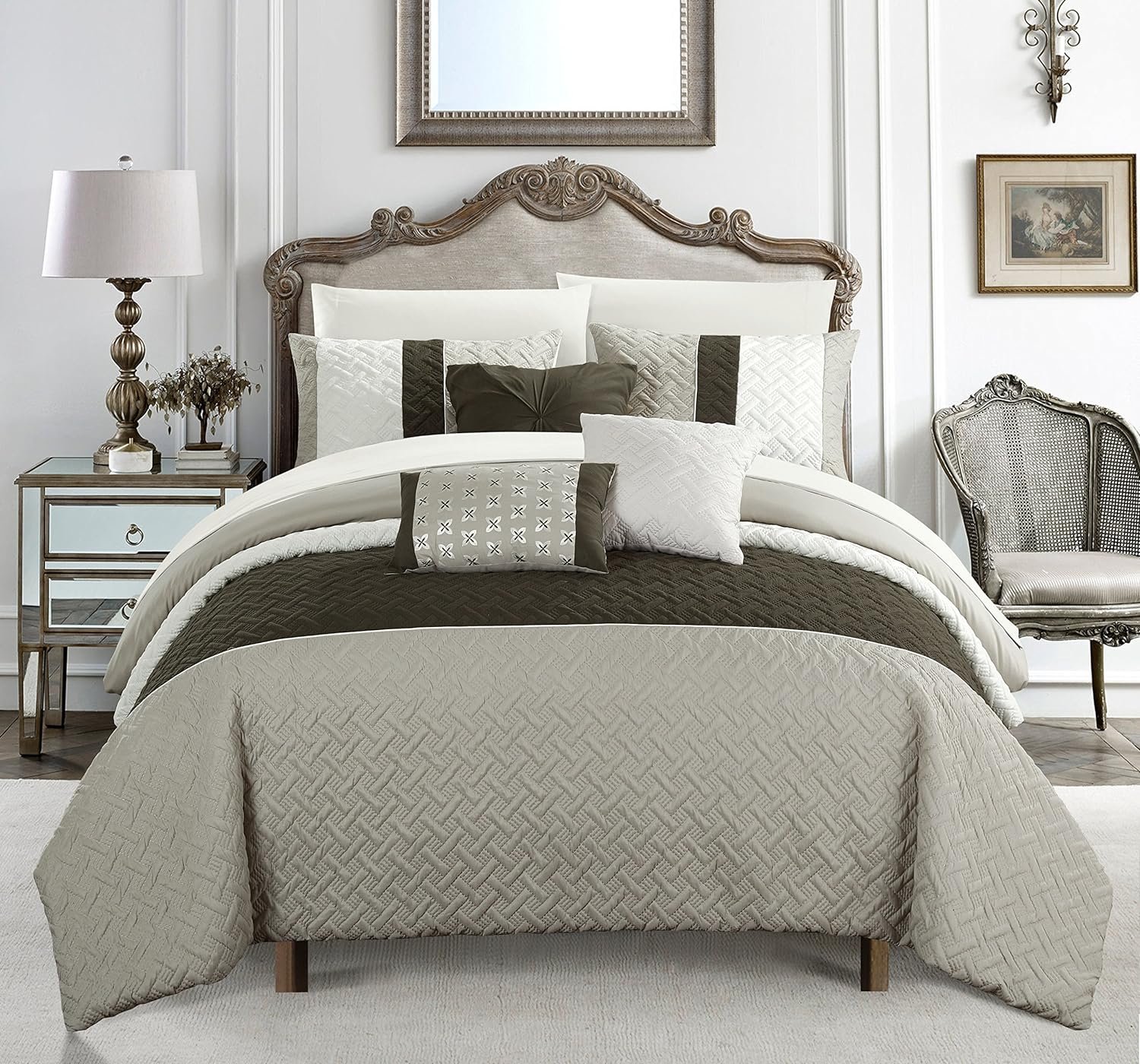 An elegant fashion forward bedding collection with everything you need for a complete bedroom décor makeover; Elegant and sophisticated color block design with quilted embroidery stitching; Super-soft microfiber sheets, design coordinated shams and trendy deco pillows are included to complete the look; LUXURIOUS SUPER SOFT PLUSH MICROFIBER – The comforter is made with premium quality cotton-feel brushed microfiber for an amazing night’s sleepDOWN ALTERNATIVE HYPOALLERGENIC FILLING –