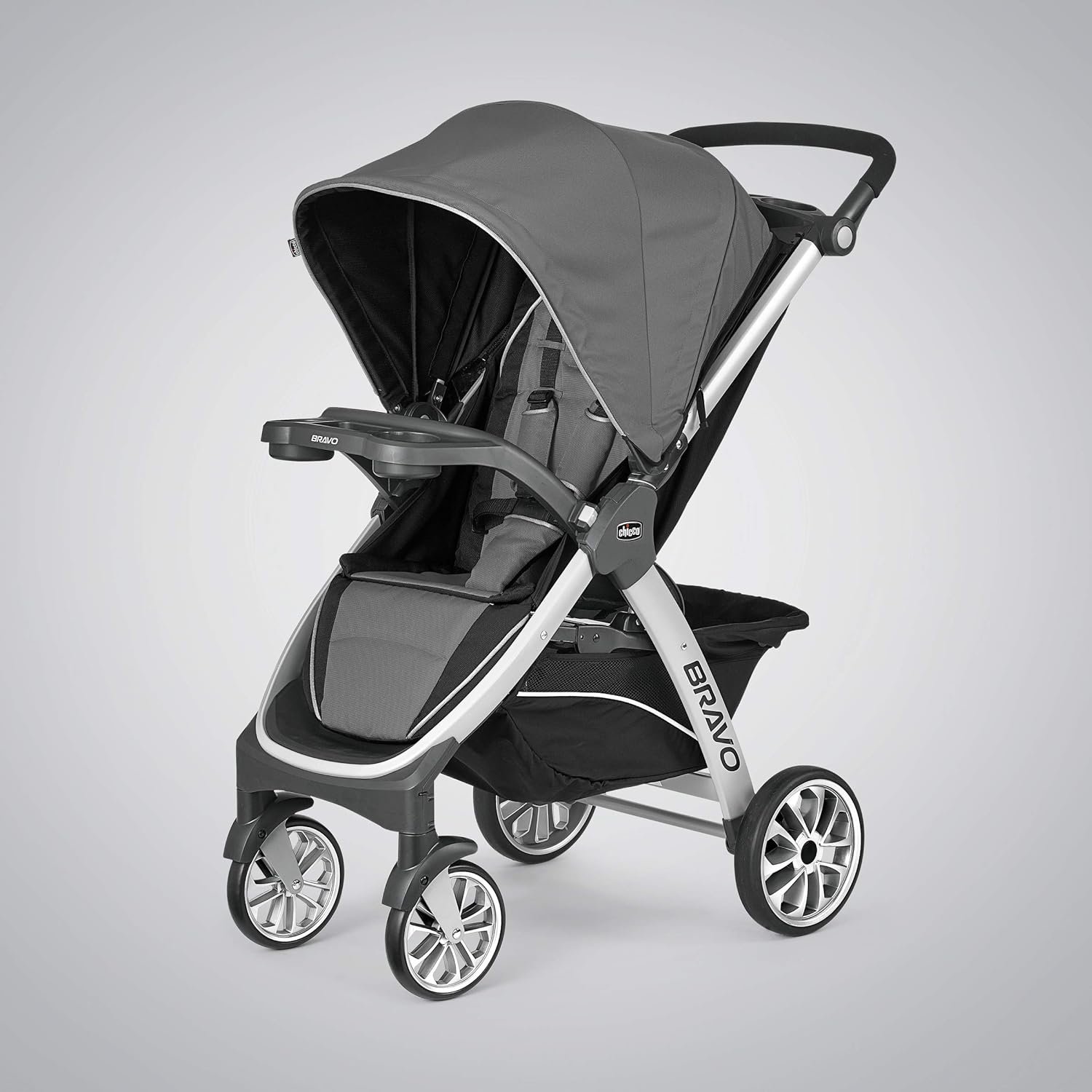 Detachable cup holder tray clicks onto bravo stroller easily and securely