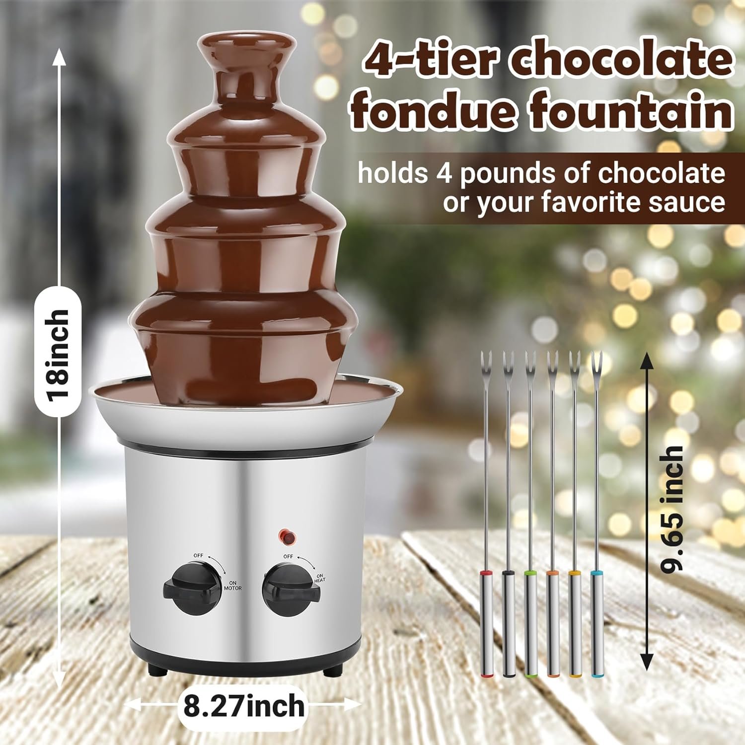 CHOCOLATE FONDUE FOUNTAIN SET: Our electric chocolate fondue pot has a 4-tier fountain tower with 6 9.5-inch stainless steel forks and a large 4-pound capacity heated bowl that is perfect for Christmas, Halloween, Thanksgiving and weddings.