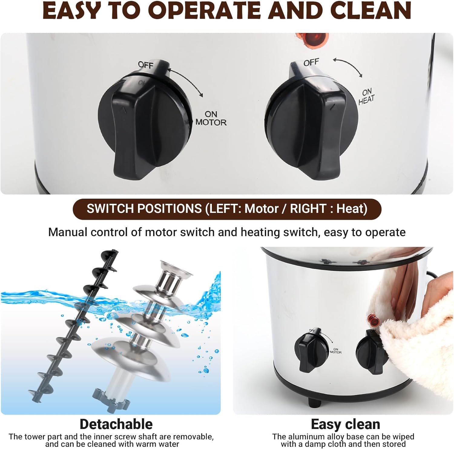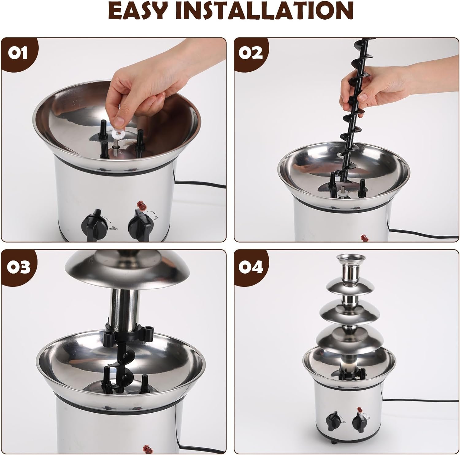 EASY TO USE AND CLEAN: Our chocolate fountain is easy to assemble, disassemble and clean, please heat the chocolate to liquid before use, please read and follow the instructions carefully, do not immerse the machine in water when cleaning. (Note: Only chocolate sauce and other sauces can be used, the heating bowl can only heat the chocolate, not dissolve the chocolate pieces).