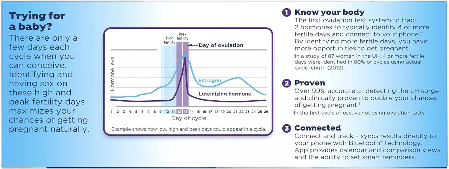 Clearblue Connected Ovulation Test System is the first and only test system to track two unique hormones and connect to your phone via Bluetooth technology with smart reminders based on your personal cycles Typically identifies four or more fertile days