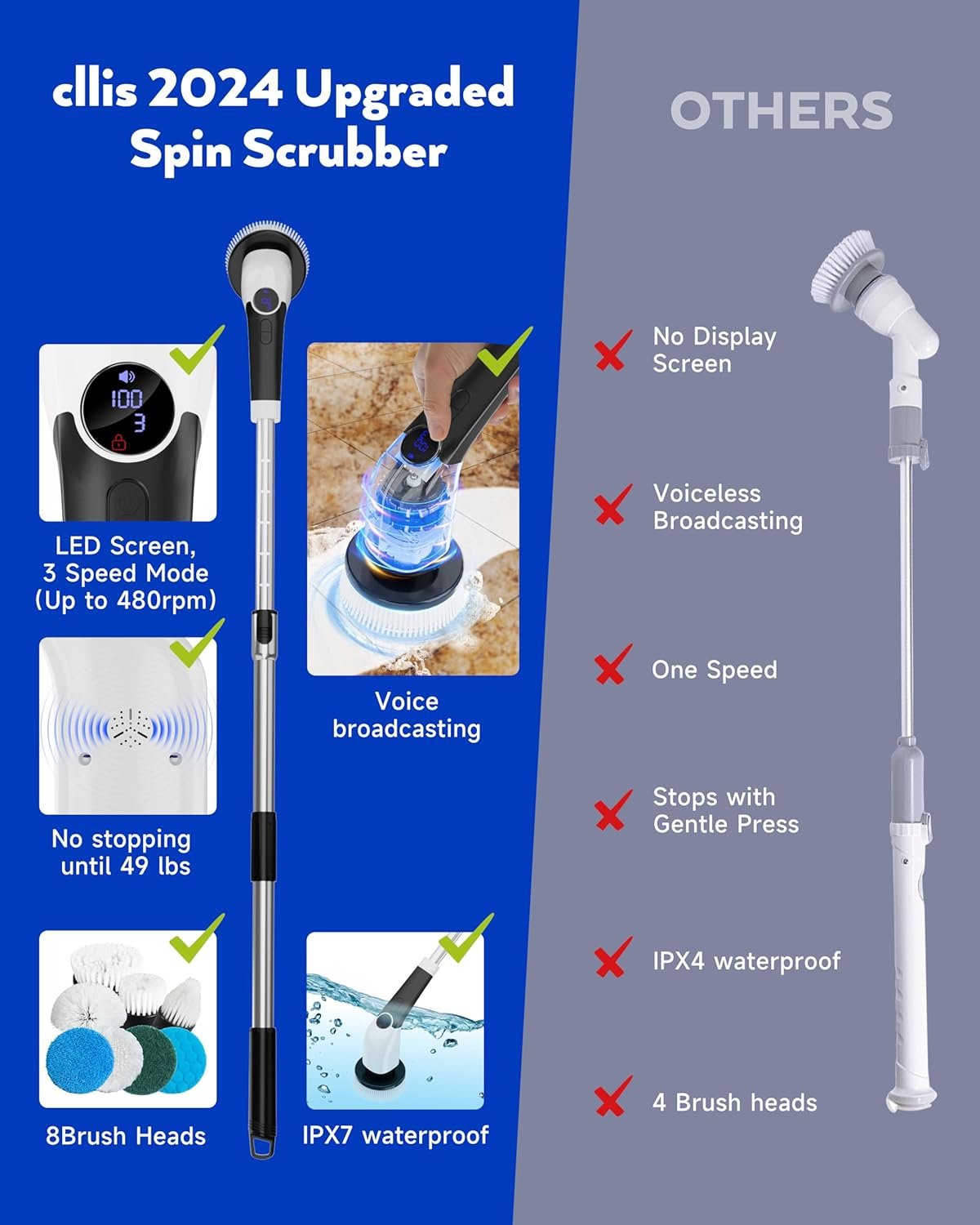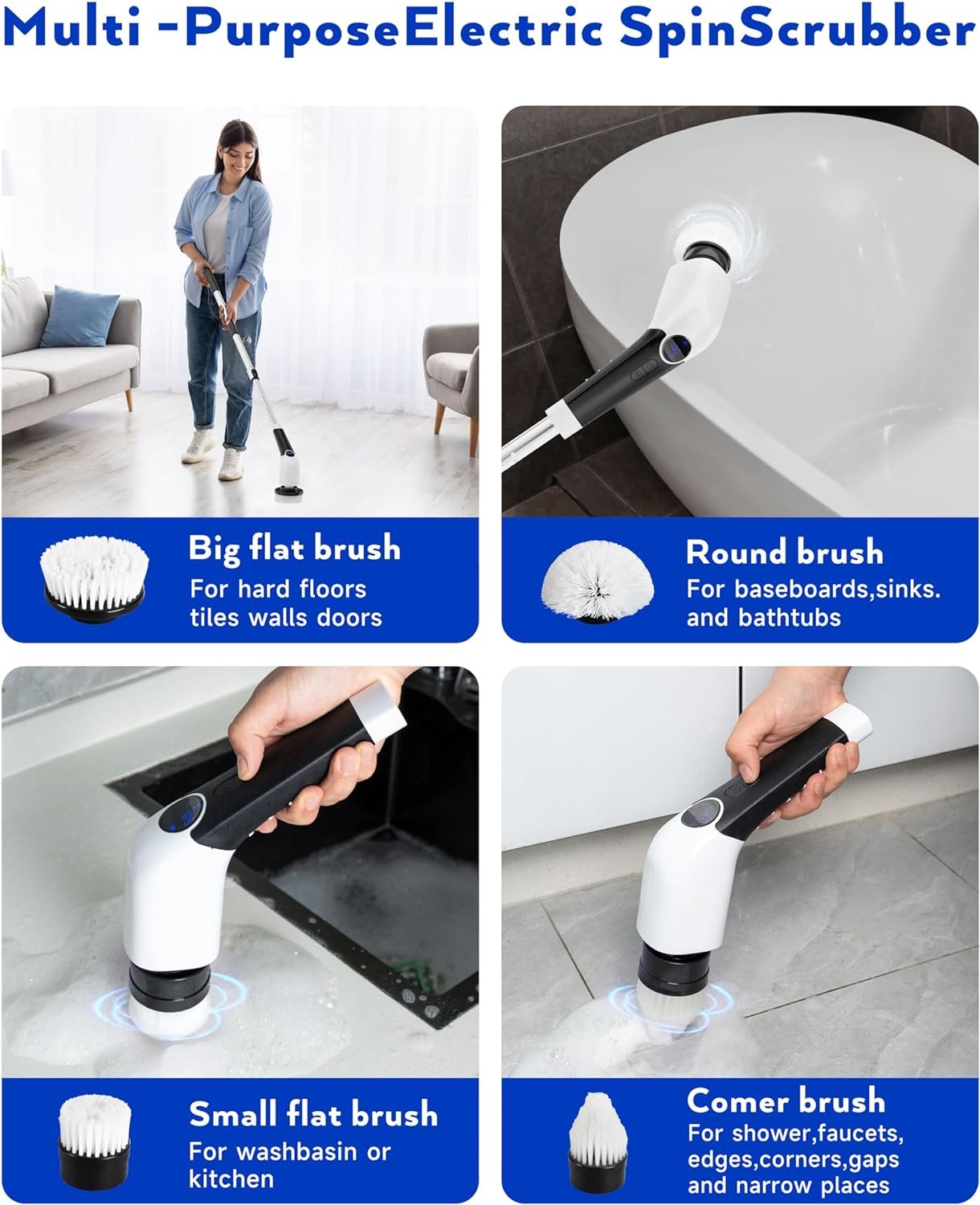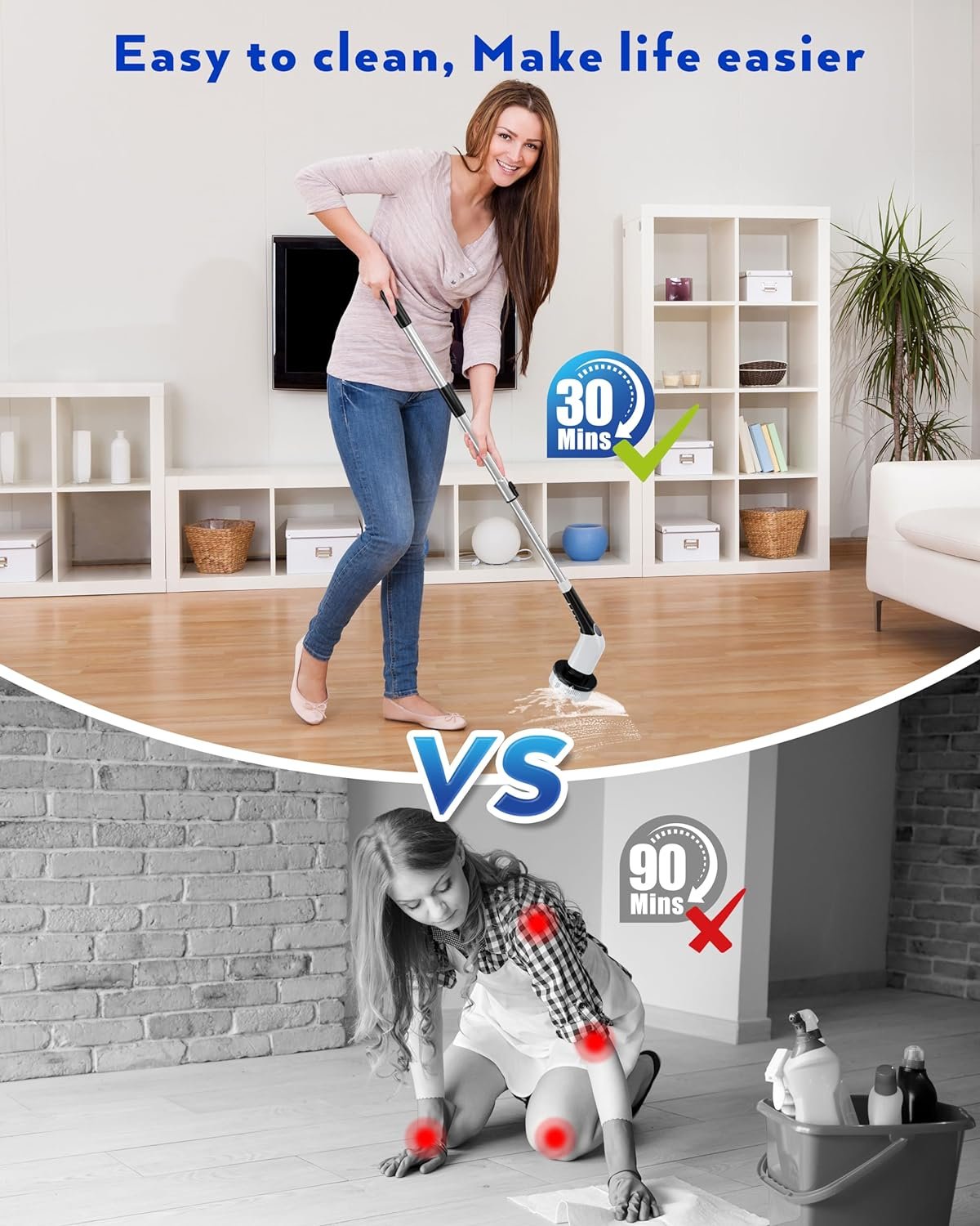 【Save Time & Save Effort】Do you feel tired for cleaning? The upgraded electric spin scrubber uses 35W Germany pure copper motor. You just need to stand straight and press a button and then the job is done, stain is gone. The electric scrubber for cleaning allows you not to bend down and kneel to clean, avoiding arm pain, knee pain, back pain and all kinds of discomfort. The shower scrubber with long handle is especially helpful for housewives or elderly.
