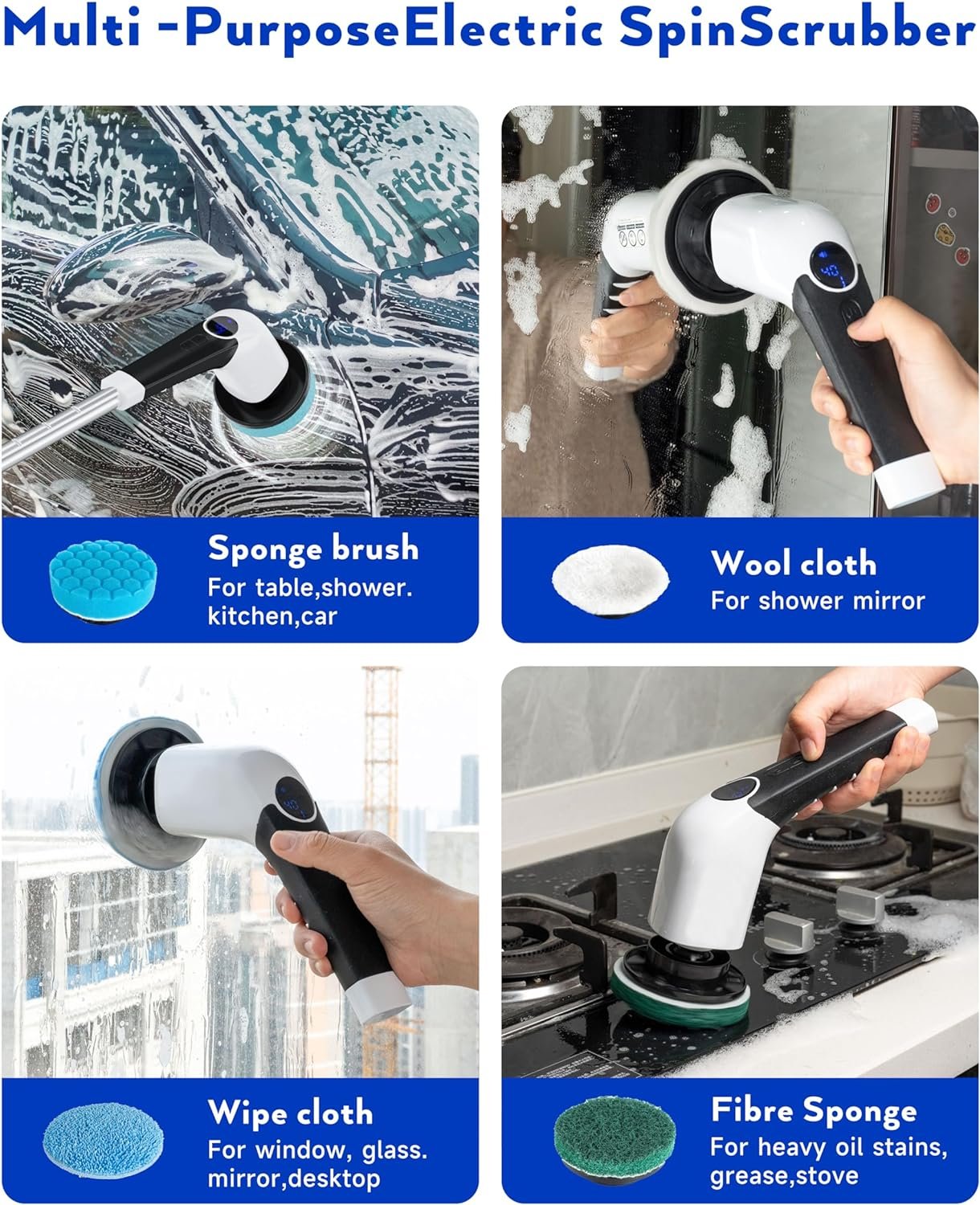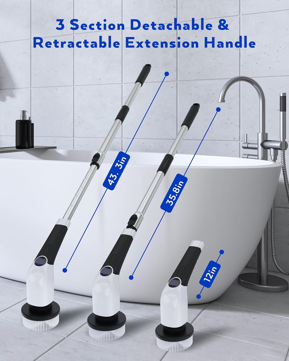 【3 Section Extendable Handle Electric Spin Scrubber】 The handle of shower scrubber for cleaning adopts 3-section design(12/35.8/43.3 inches),with adjustable extension tube that is very easy to install and remove. Whether it’s a countertop bathtub or a ceiling,you can easily clean it without having to bend over. Suitable for bathroom, shower, bathtub, tile, floor, sink, kitchen,stove,grill,grout,edges,corners,gaps,grooves,window and so on.