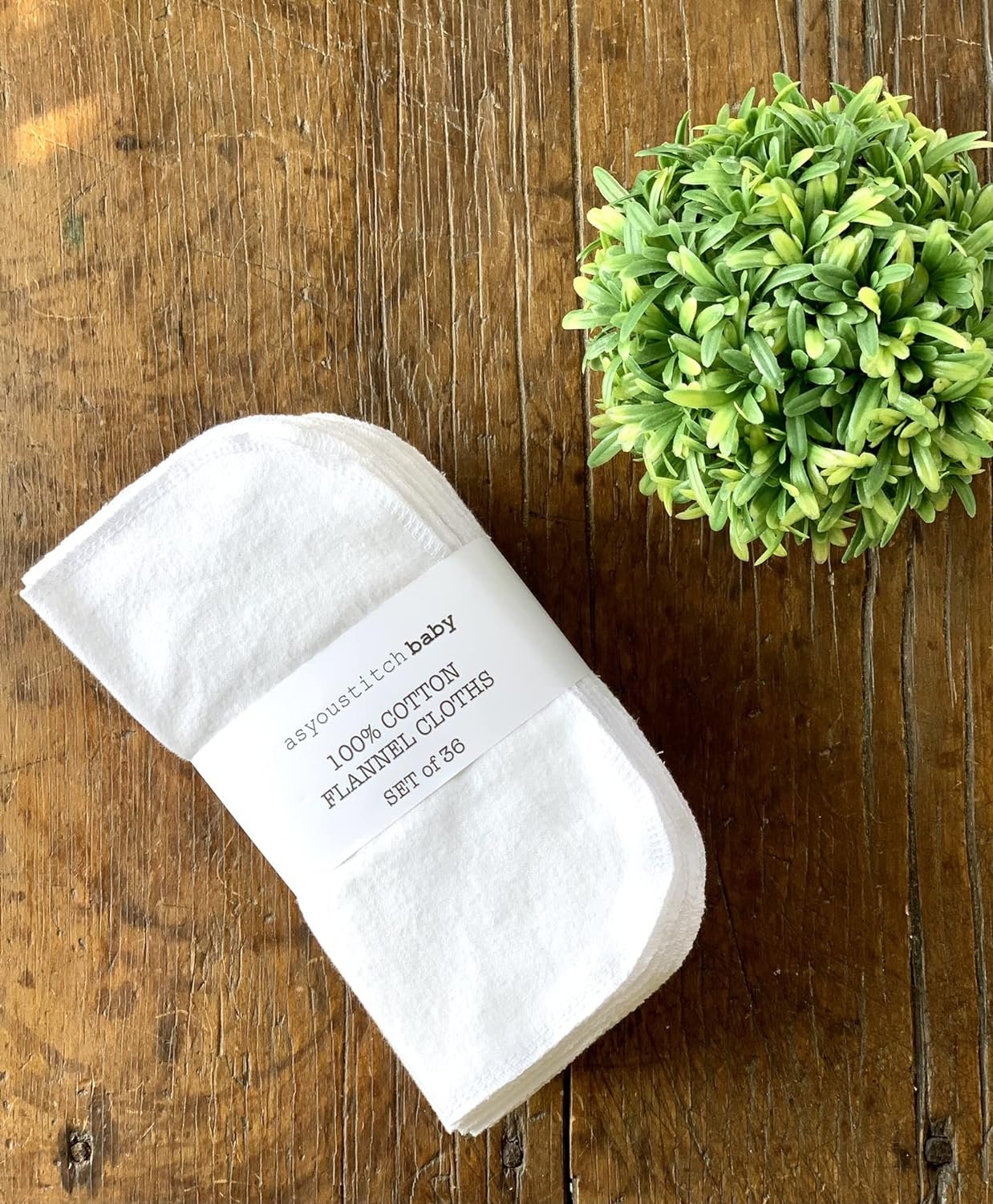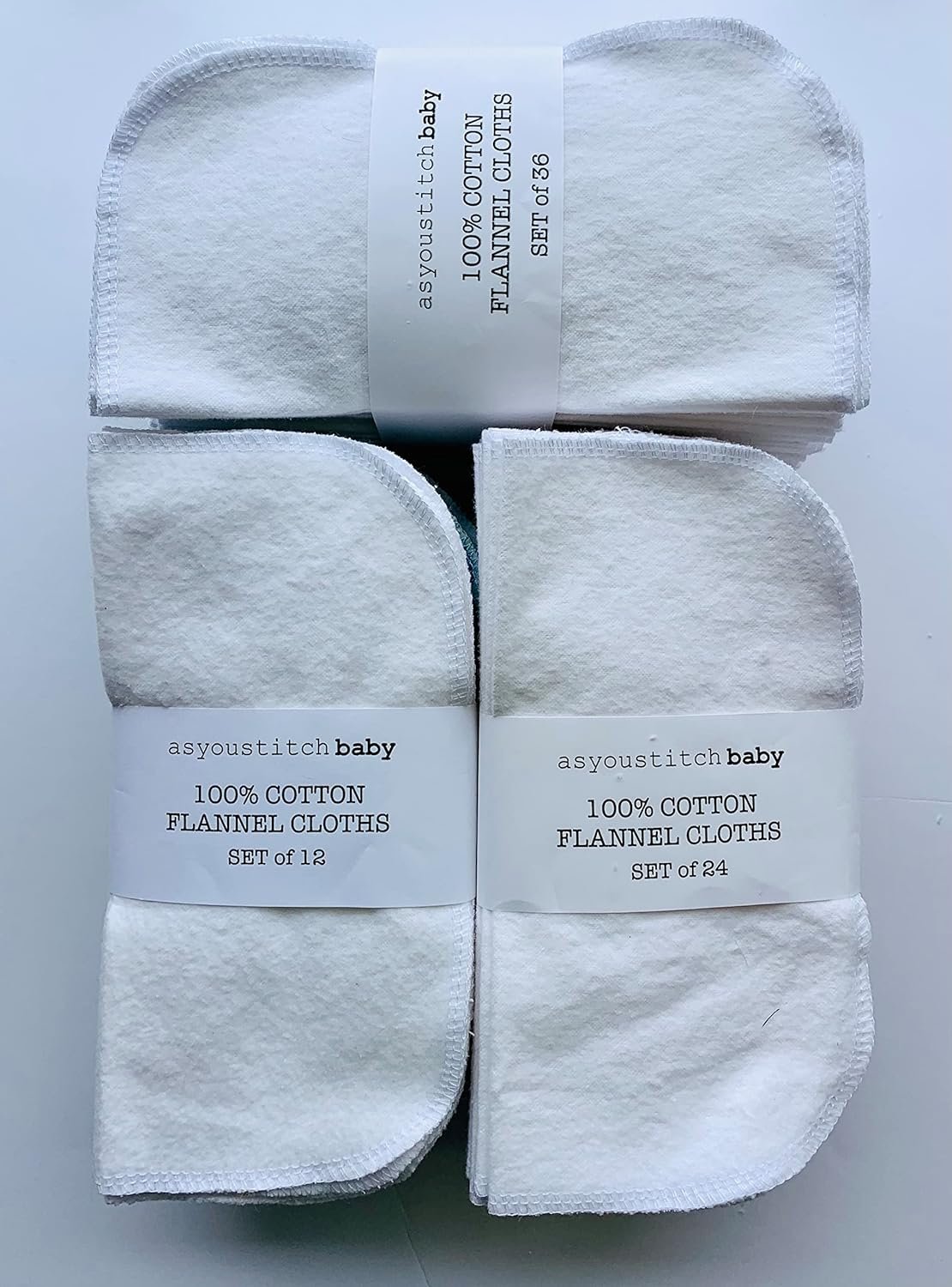 These 8 inch square cloth wipes are made of one layer of super soft 100% cotton flannel. Now available in sets of 36, 24 or 12. Whether you use these to clean baby’s hands, face, or bum, you’ll love knowing that they are gentle on your little one’s skin. As an added bonus, using reusable wipes means lowering your carbon footprint! This is a perfect starter kit for cloth diapering.These are a great addition to any cloth diapering household. Folded in half, they fit perfectly in a used wipe container or warmer. I keep mine in a wipe warmer with a little water, and then throw them into the dirty diaper bucket along with soiled cloth diapers. They wash up so nicely and dry in a flash! I like to keep a separate stash in the kitchen for cleaning little faces after meal time. They make great napkins for little diners, too! The edges of these wipes are machine serged for durability, and the corners are rounded. Wipes are pre-washed and shrunk. Machine wash (hot or cold, doesn’t matter!) and dry.