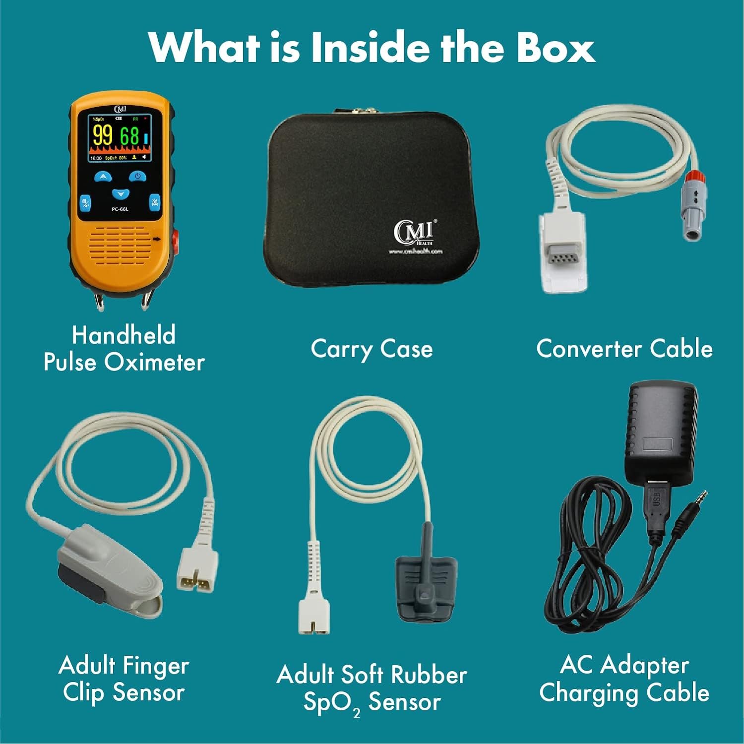 𝗜𝗡𝗖𝗟𝗨𝗗𝗘𝗗 – Handheld PC-66L Pulse Oximeter; Adult finger continuous monitoring and spot checking sensors, Converter cable; Data cable; Stand; Carry case; Charging cable; AC adapter. CMI Health Handheld Pulse Oximeters are not compatible with any form of ear lobe or forehead sensor.
