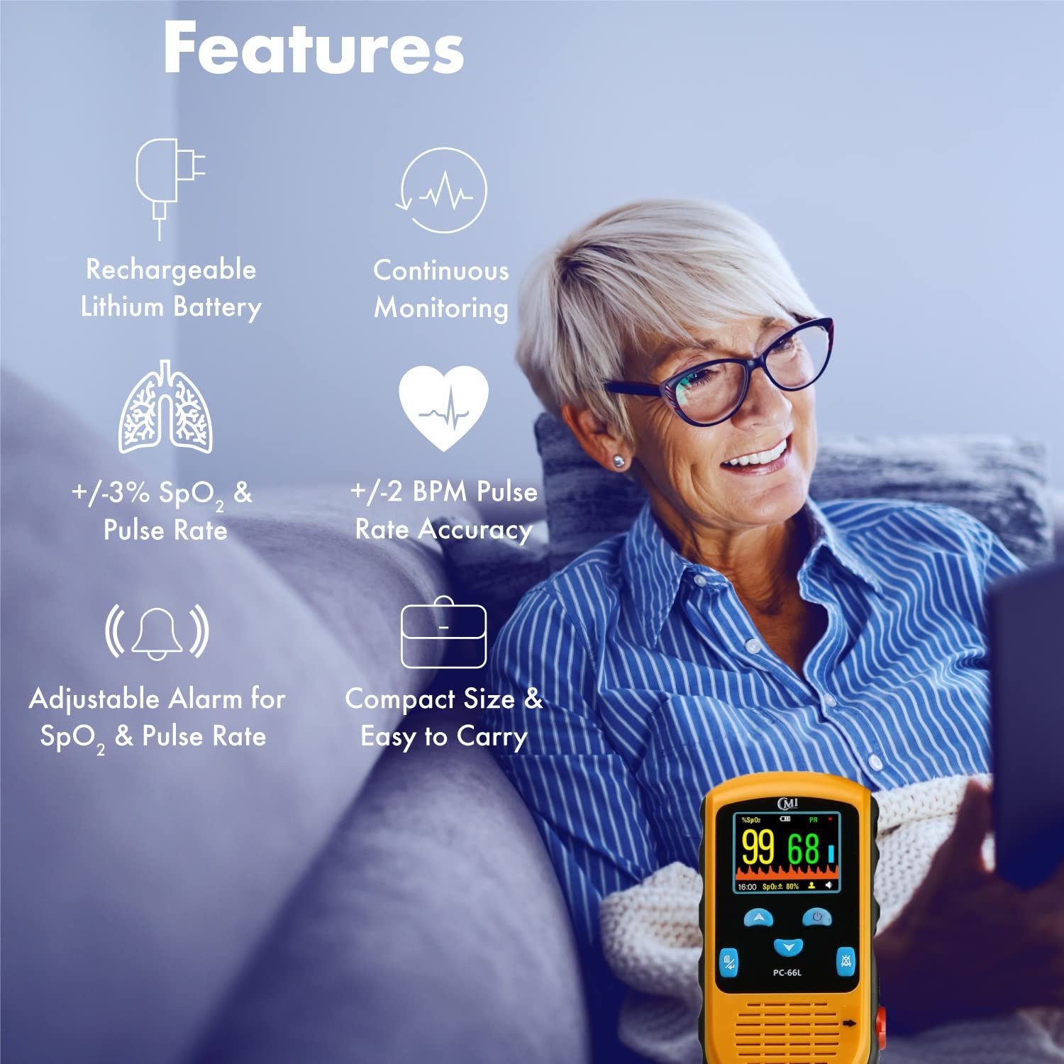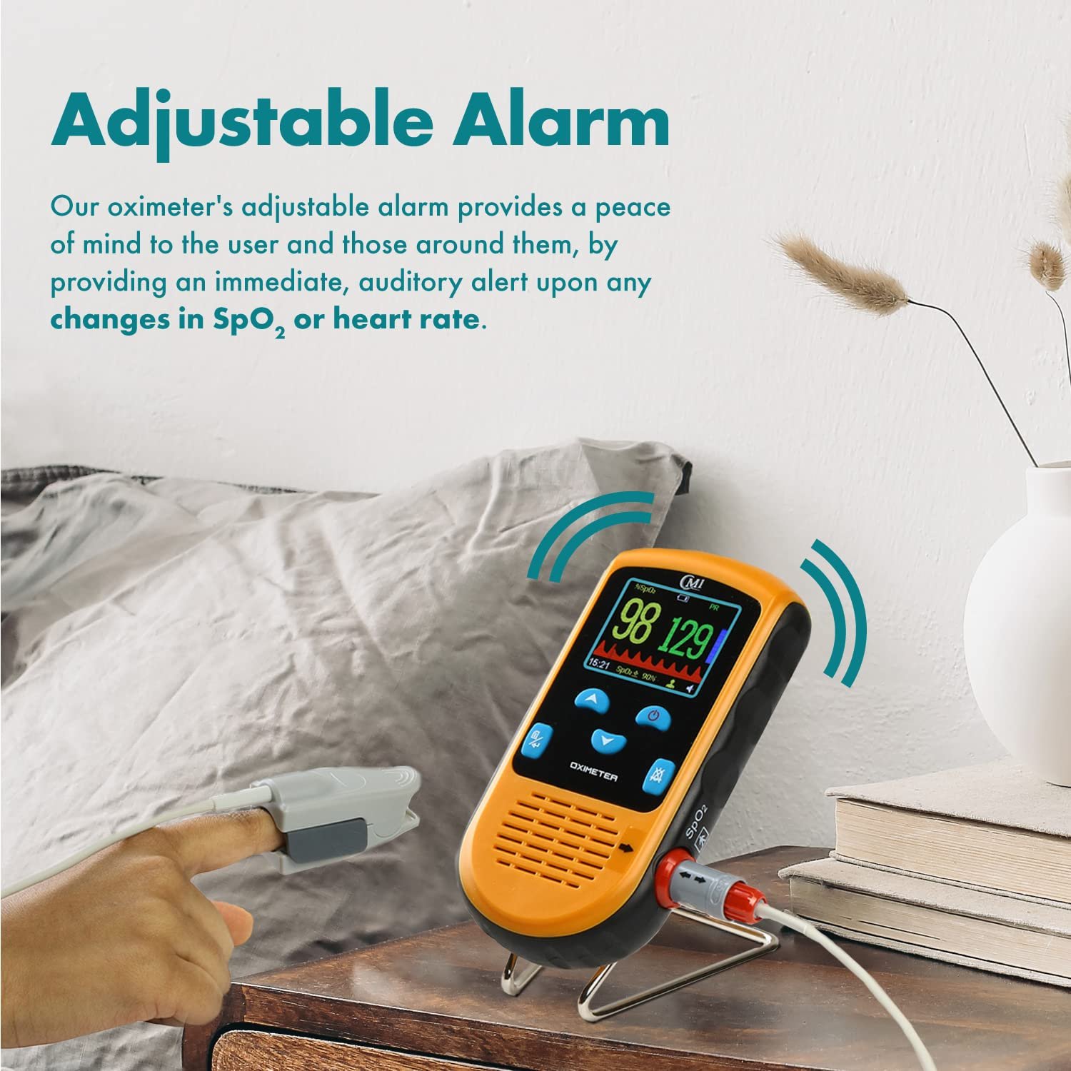 K𝗘𝗘𝗣𝗦 𝗬𝗢𝗨 𝗔𝗟𝗘𝗥𝗧 – The lightweight CMI Health Handheld Pulse Oximeter’s mute function will cease and the standard beeps will resume if the levels drop below the set threshold for more than 90 seconds or if the device is unable to get a reading