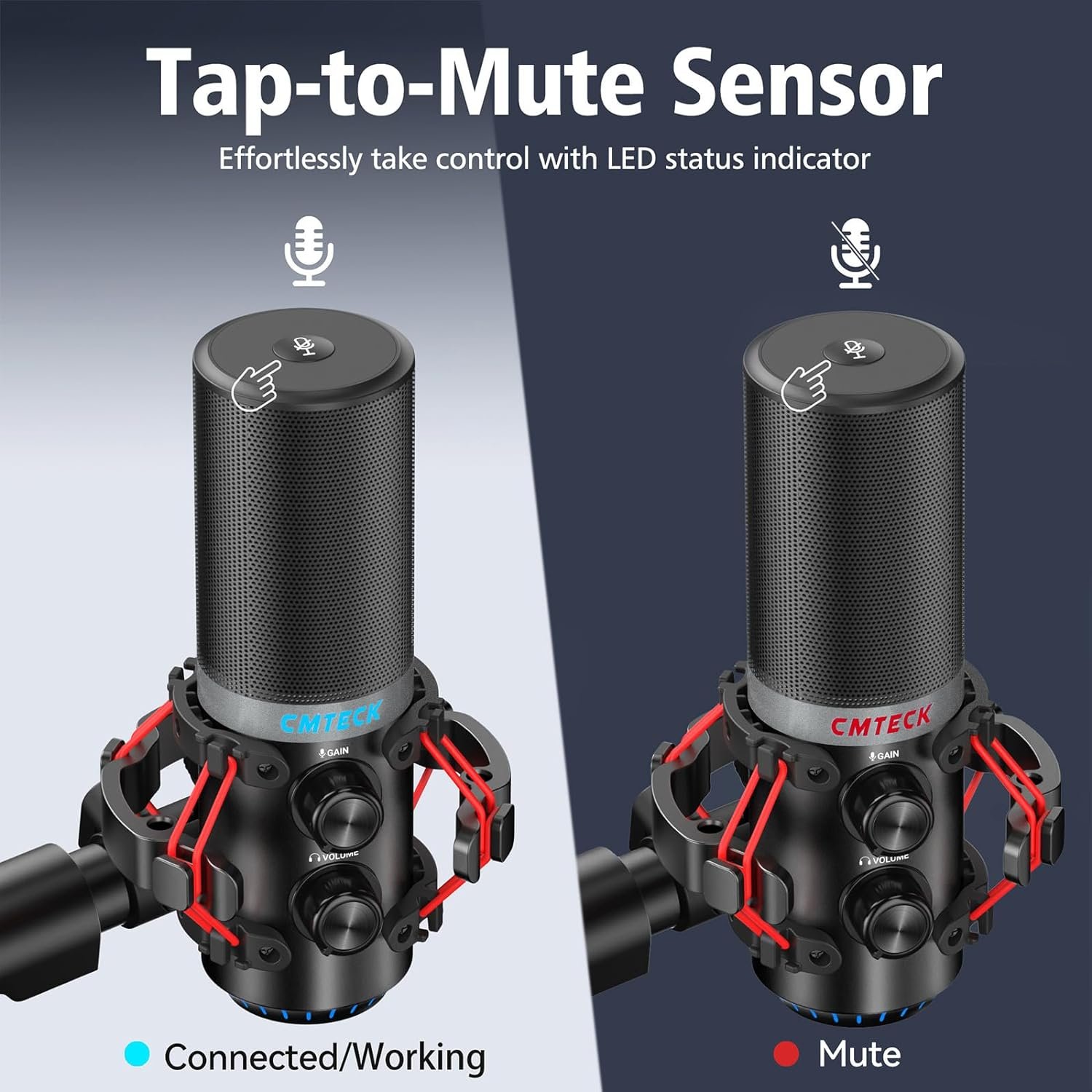 Tap-to-Mute with LED Indicator – This microphone simplifies muting with a convenient tap-to-mute function located on the top. An LED mic status indicator shows whether it’s in use (green) or muted (red), preventing accidental broadcasting mishaps.