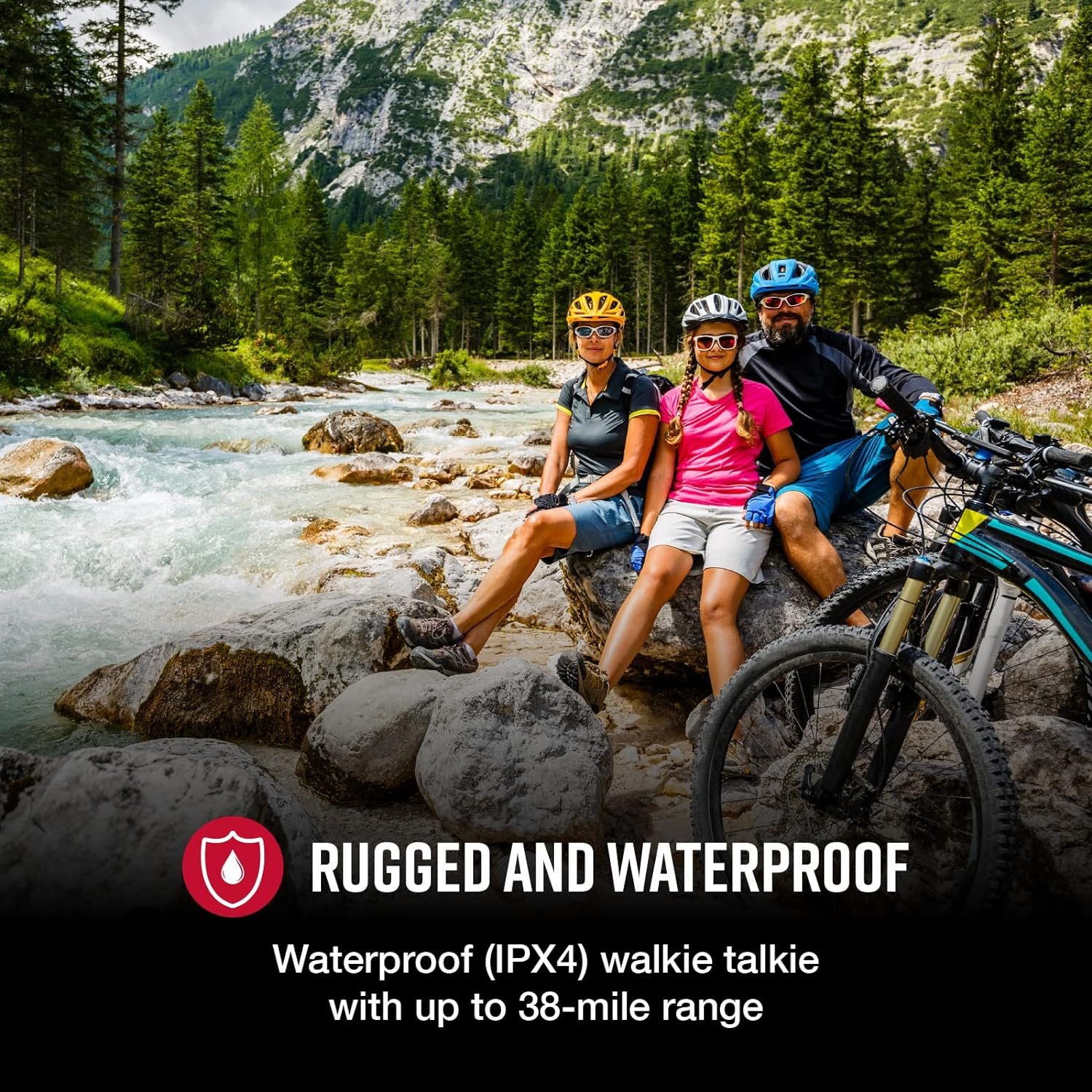 Waterproof – Waterproof (IPX4) walkie talkie with up to 38-mile range, built with a strong shell and drop-proof design so your radio can withstand harsh conditions. Included headset is protected against dust and water splashes from all directions.