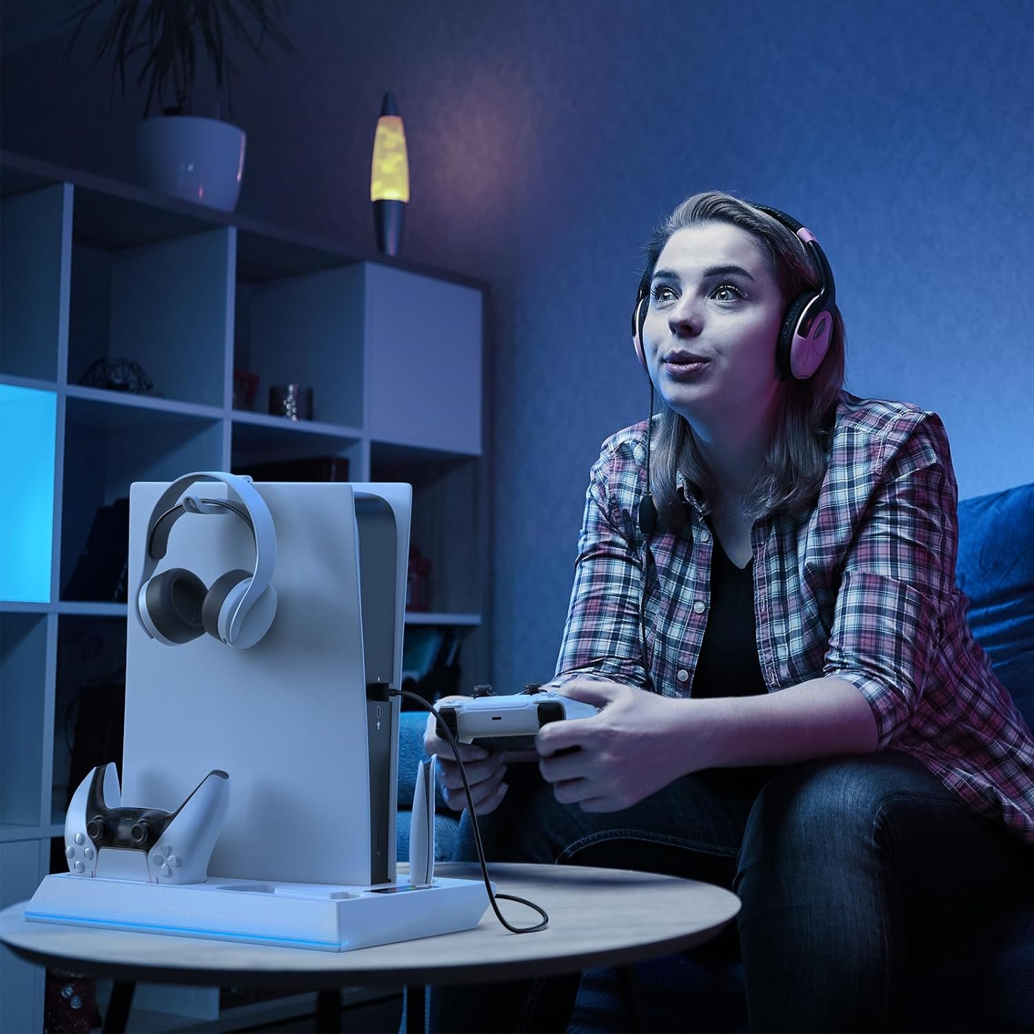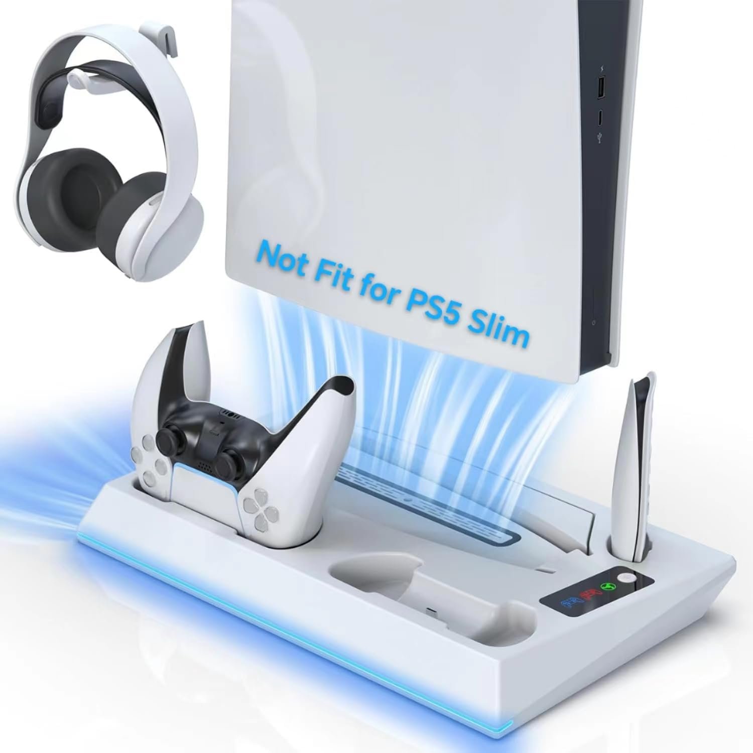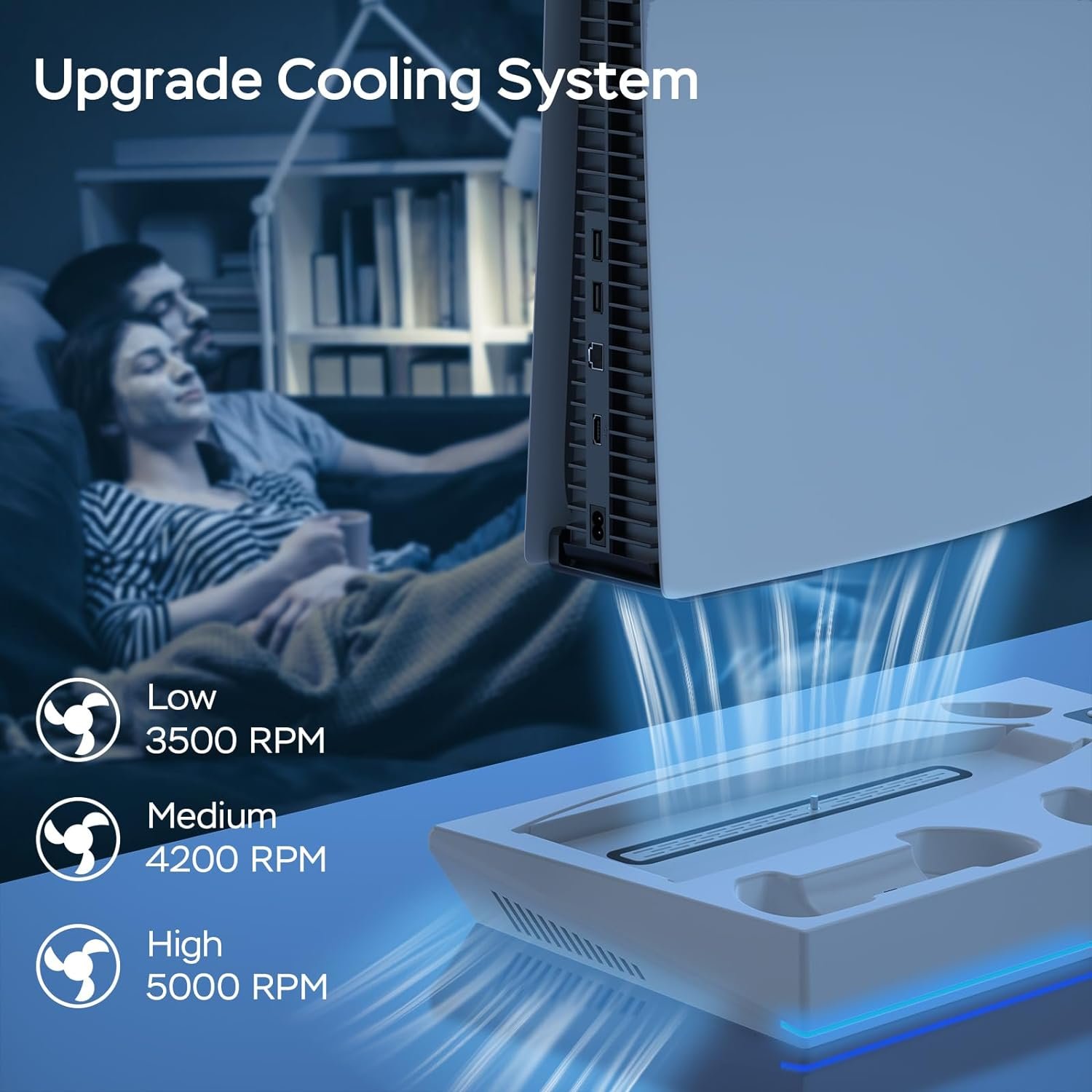 3-Level Silent Cooling Fan Speed: The PS5 stand effectively dissipates heat by pulling hot air from the console bottom. Two built-in silent cooling fans with a speed of 5000 rpm provide efficient cooling assistance for the PS5 console. Control the fan speed as needed with the switch on the bottom of the PS5 cooling stand. The stand also features blue LED lights to complement the PS5 console.