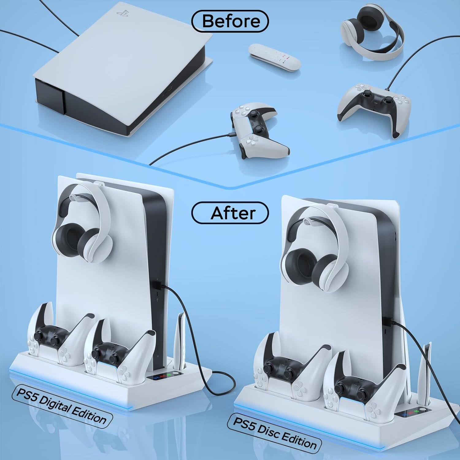 Dual Fast PS5 Controller Charging & Multiple Power Supply Methods: The PS5 charging station efficiently charges two PS5 controllers simultaneously within 3.5-4 hours. LED indicators display the charging status: Red for charging, Blue for fully charged/standby. Charge your PS5 controllers using your PS5 console or a 5V/3A fast AC adapter. It serves as an enhanced replacement for the official PS5 stand. Note: The charging station automatically disconnects power after a full charge.