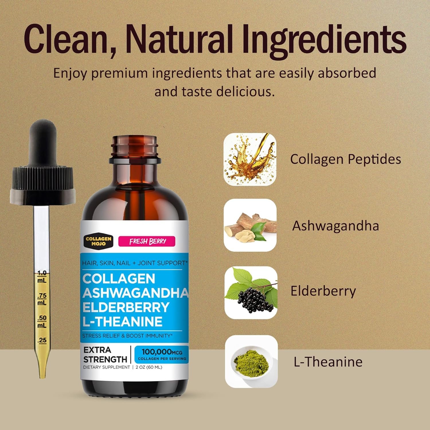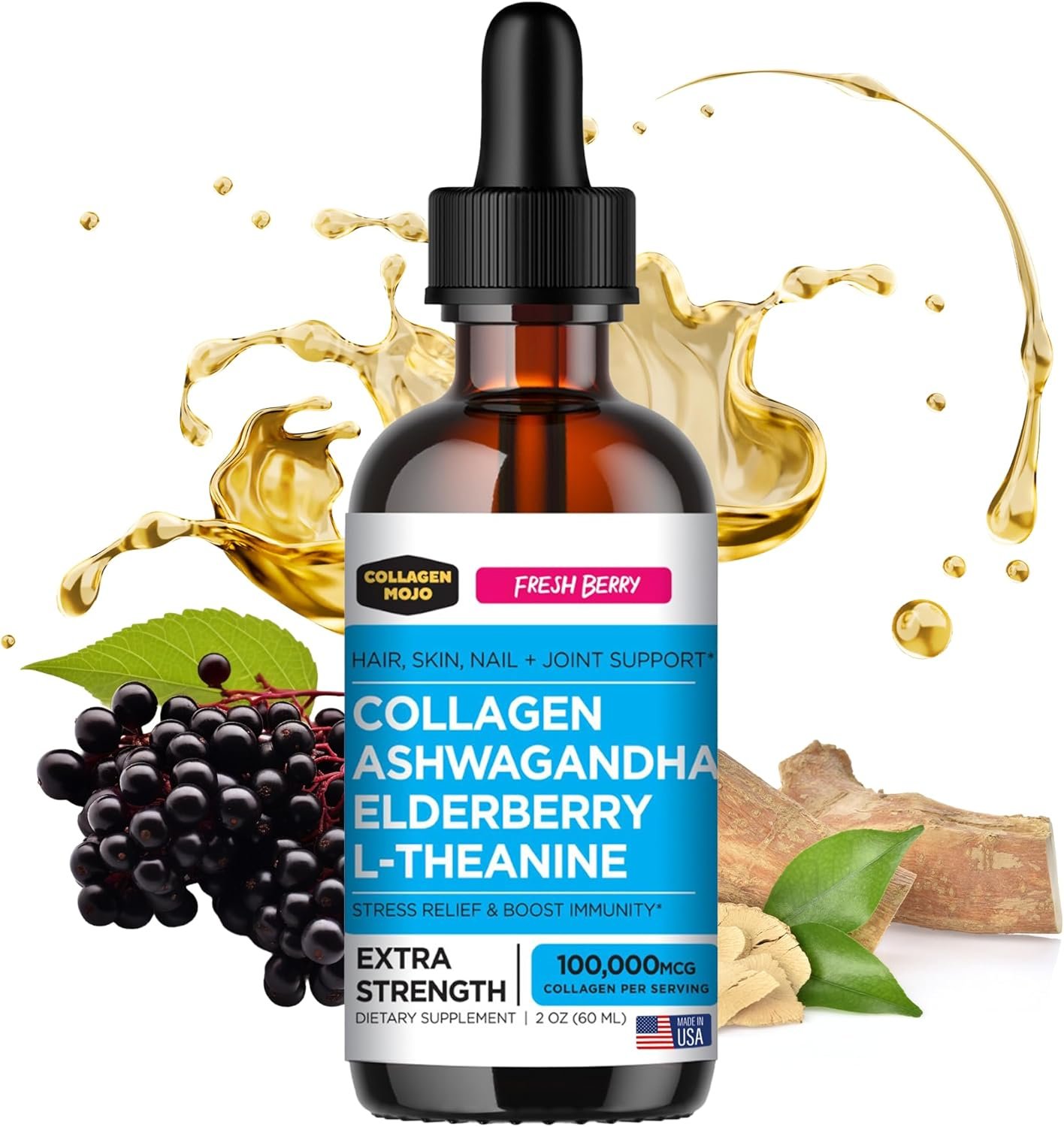 Premium Ingredients: Discover Collagen Mojo’s Liquid Collagen Peptides with Ashwagandha, Elderberry, and L-Theanine. Each serving delivers an impressive 100,000mcg of Collagen and offers a refreshing berry flavor. Just one dropper under your tongue and suitable for both women and men. Our blend is convenient, delicious, and easy to incorporate into your daily routine.