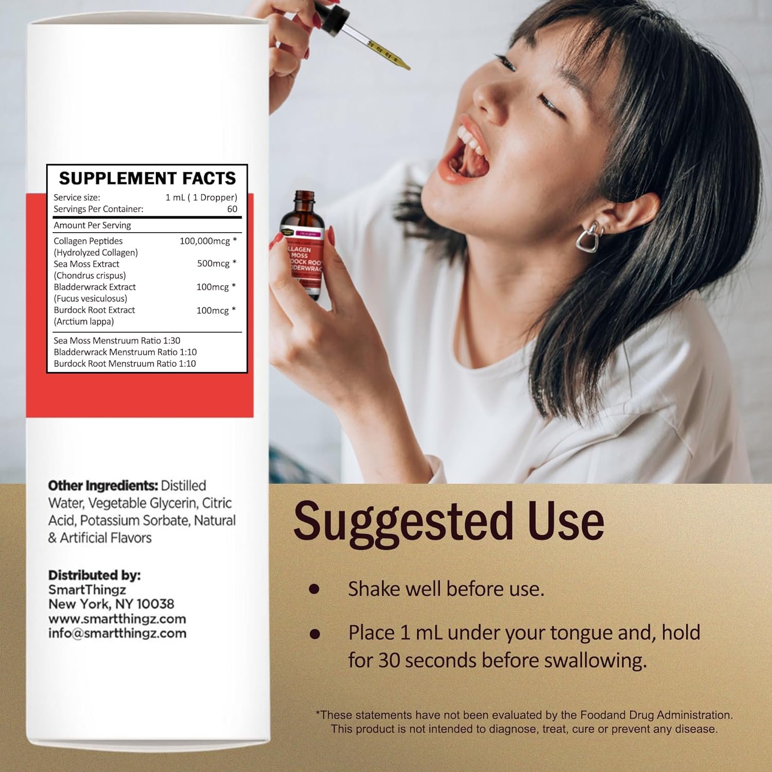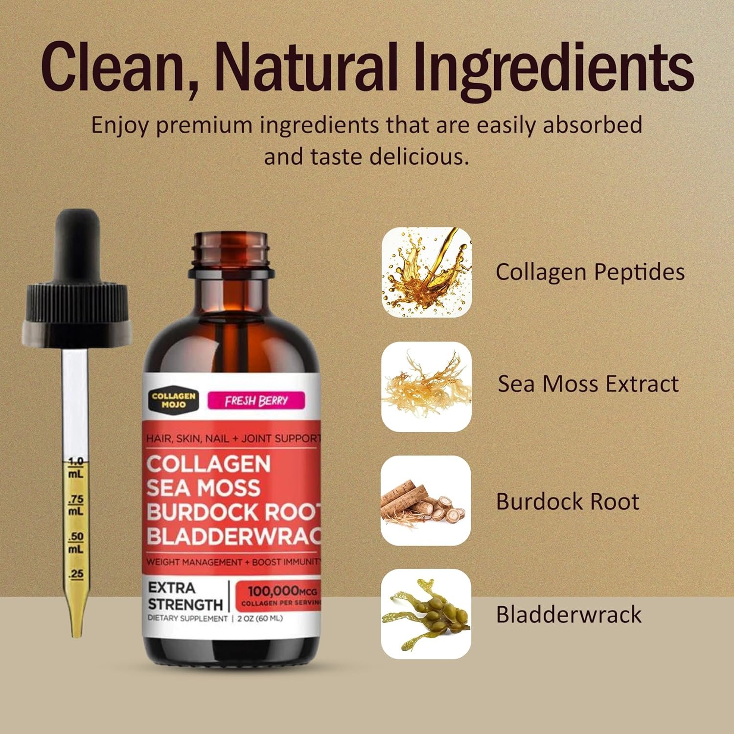 Premium Blend for Optimal Health: Elevate your wellness with Collagen Mojo’s premium blend of hydrolyzed liquid collagen peptides, sea moss, burdock root, and bladderwrack. Each serving of our collagen liquid for women and men delivers an impressive 100,000mcg of collagen and 500mg of sea moss. Designed for easy consumption, just a single dropper under the tongue for a delicious berry flavor and maximum absorption.