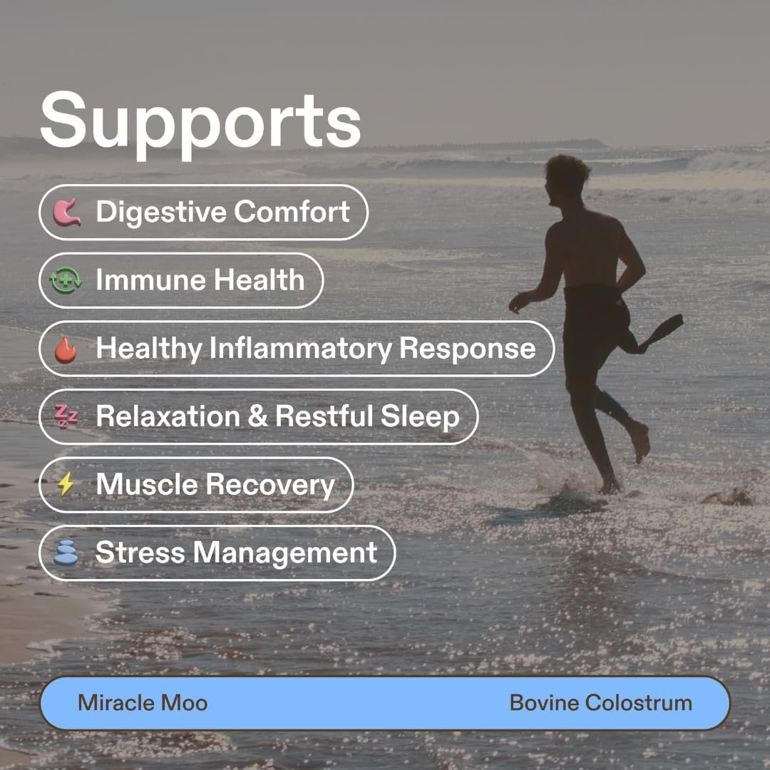 🧬 POWERED BY OUR COMMITMENT TO QUALITY: MiracleMoo offers a nourishing blend designed to complement your wellness routine. Support your digestive health, muscle recovery efforts, and your immune system with our Colostrum and ImmunoLin formula. Enhance your well-being and maintain focus to support your mind and body daily