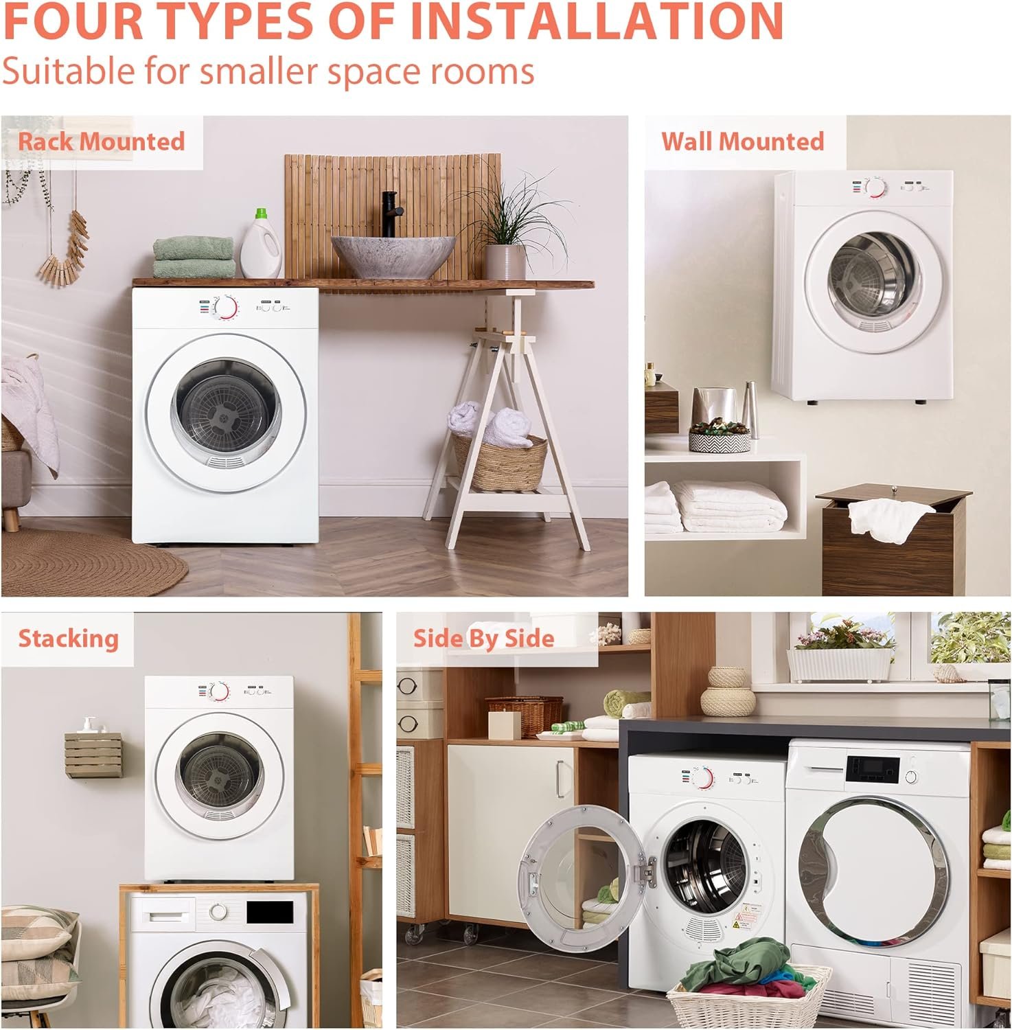 Product 2: 【High Performance】The Euhomy compact dryer has an internal capacity of 2.65 cu ft. and could hold up to 10.5 pounds (wet clothes) , 6.5 pounds(dry clothes)power of 1050W, and a maximum temperature of 140°F to dry different kinds of clothes for the whole family. This apartment size dryer(19.3 x 17.7 x 27 in ) makes it suitable for use in small spaces such as apartments,dormitories,room and RV.
