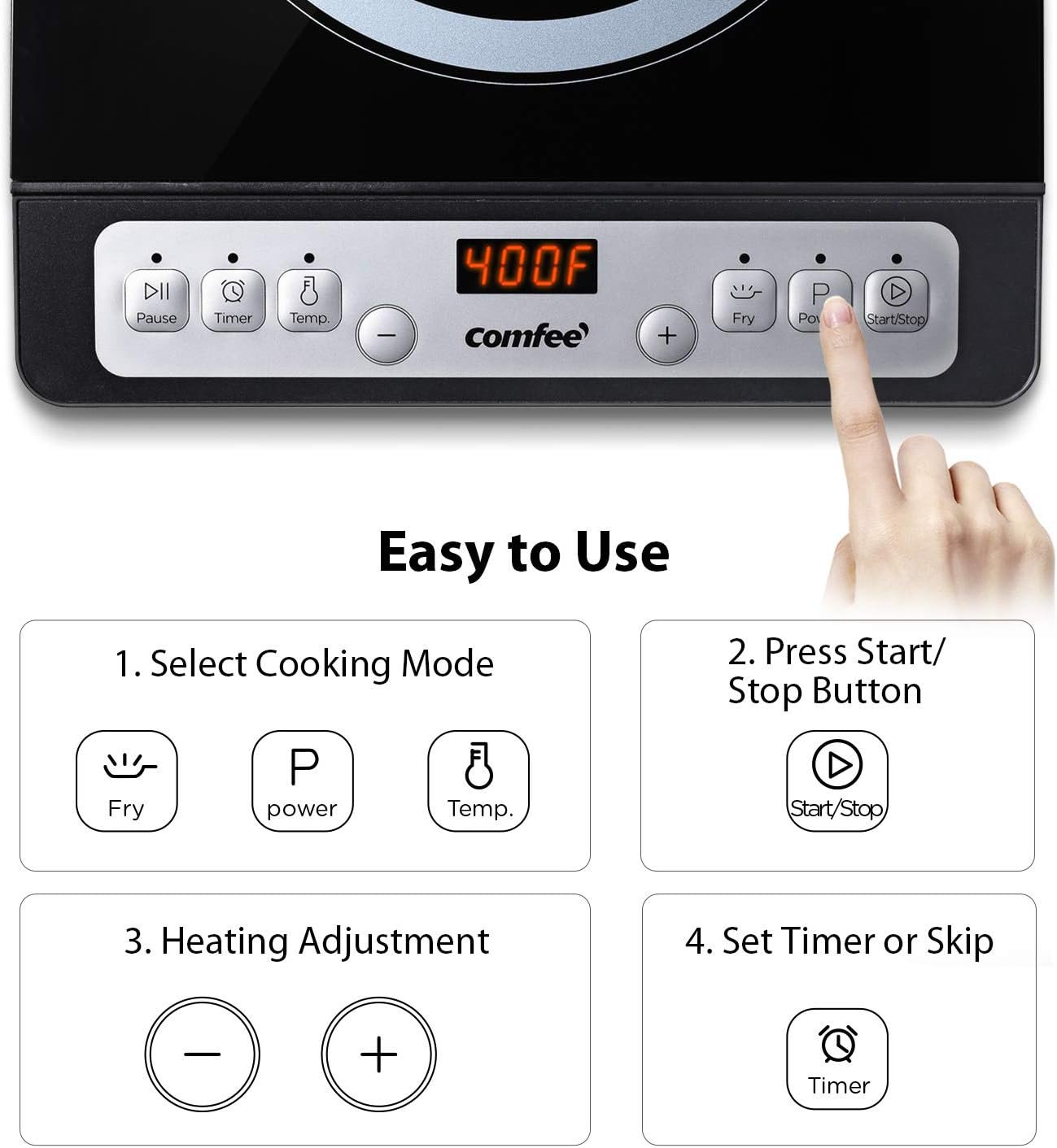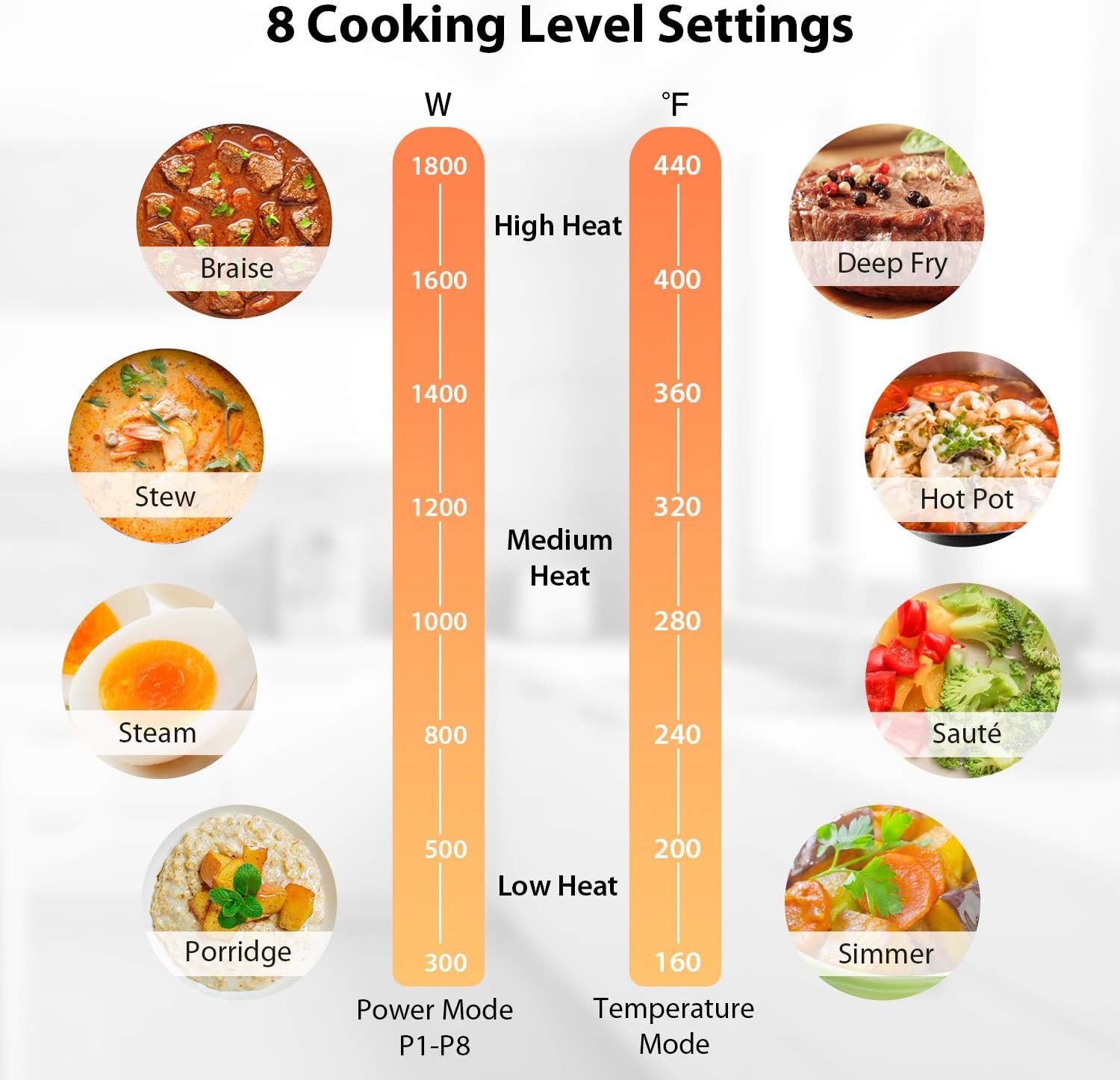 MULTI-FUNCTIONAL INDUCTION COOKTOP – 8 Power & Temperature mode from 300W to 1800W & 160 to 440℉ can meet your various cooking needs: boil, simmer, steam, stew, sauté, slow cook and fry with ease. Built-in digital timer shuts off automatically.