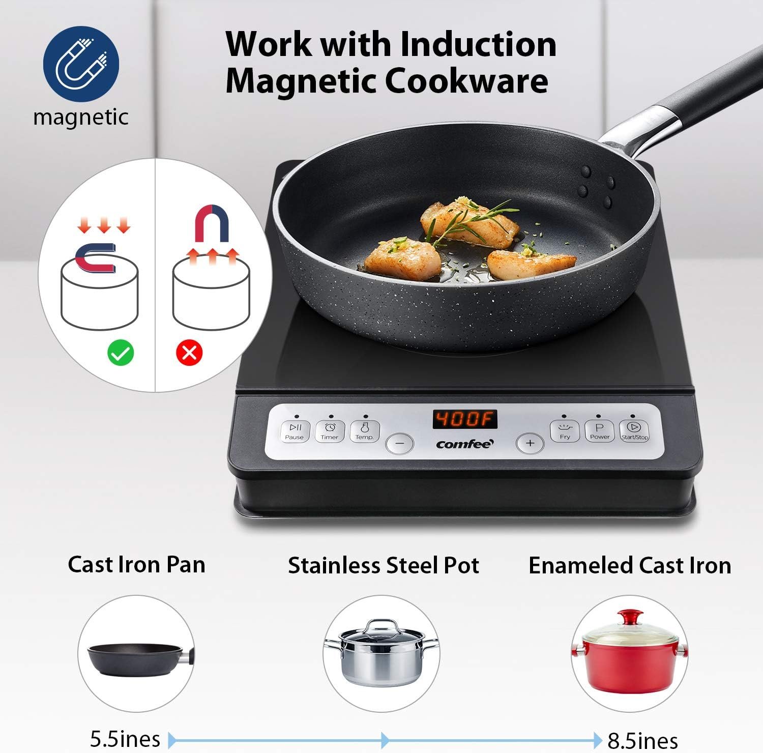 COMPATIBLE MAGNETIC BOTTOM COOKWARE – Induction burners rely on cookware to heat, so ONLY suitable for cookwares with a magnetic bottom, diameter is between 5.5 to 8.5 inches. If no or no suitable cookware is detected, it will display “U” and shut automatically after 60 seconds.