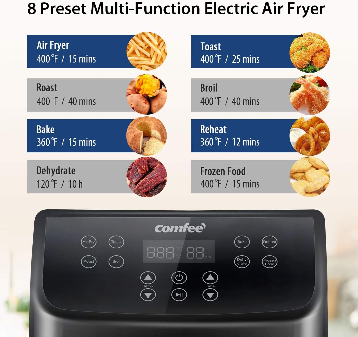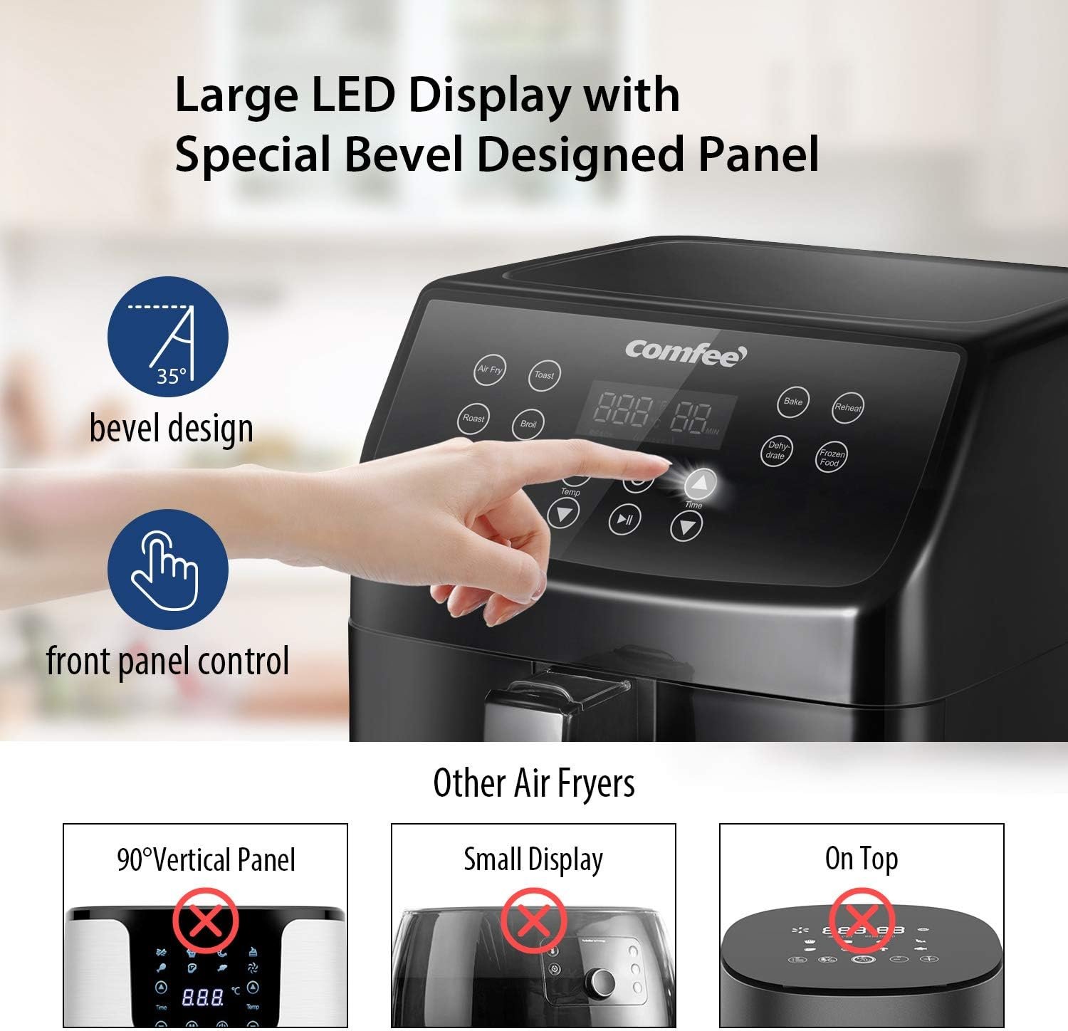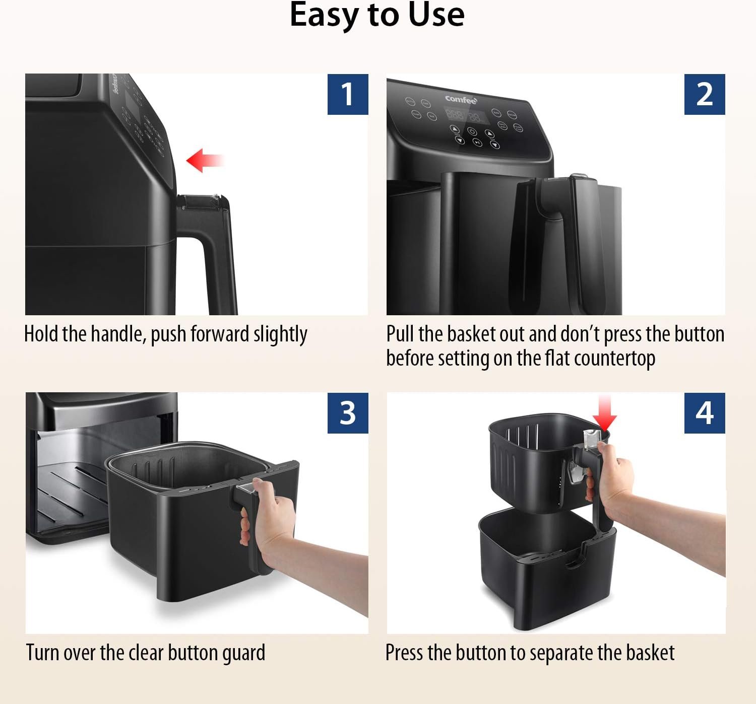 COMFEE’ digital 5.8Qt air fryer is very convenient to use and clean. You can use the preset smart programs to fry, toast, roast, broil, bake, dehydrate and reheat. The oilless air fryer oven can replace a deep fryer, microwave oven, frying pan, toaster and grill, but with crispier and tastier results. Anything they can do the best, Comfee’ Air Fryer can do better. An amazing approach towards a healthier life. You deserve it!