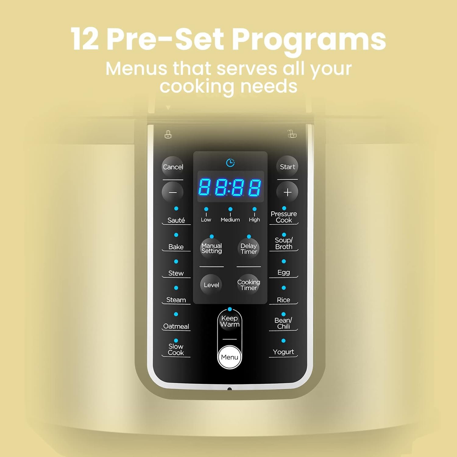 Quick One Touch Kick Start with 12 Preset Smart Programs- Electric Pressure Canner, sauté, bake, stew, steam, oatmeal, slow cook, soup/ broth, egg, rice, bean/chili, yogurt