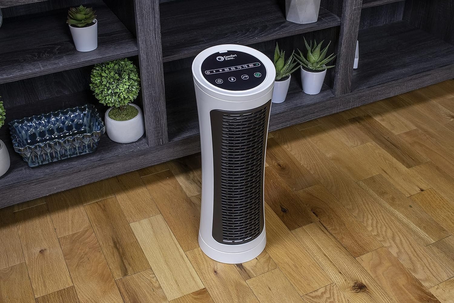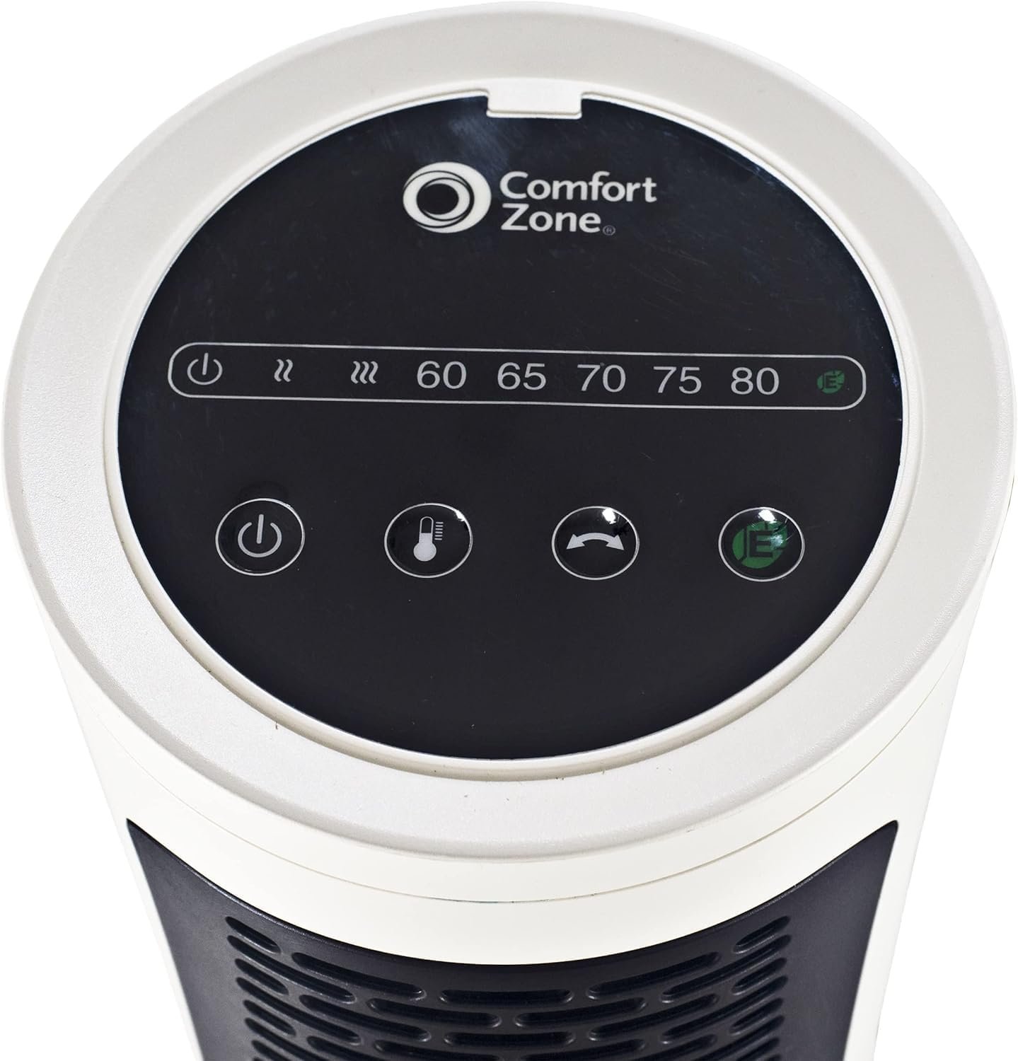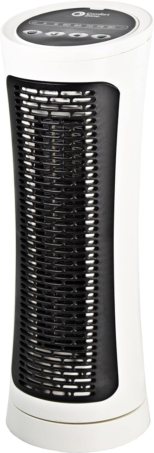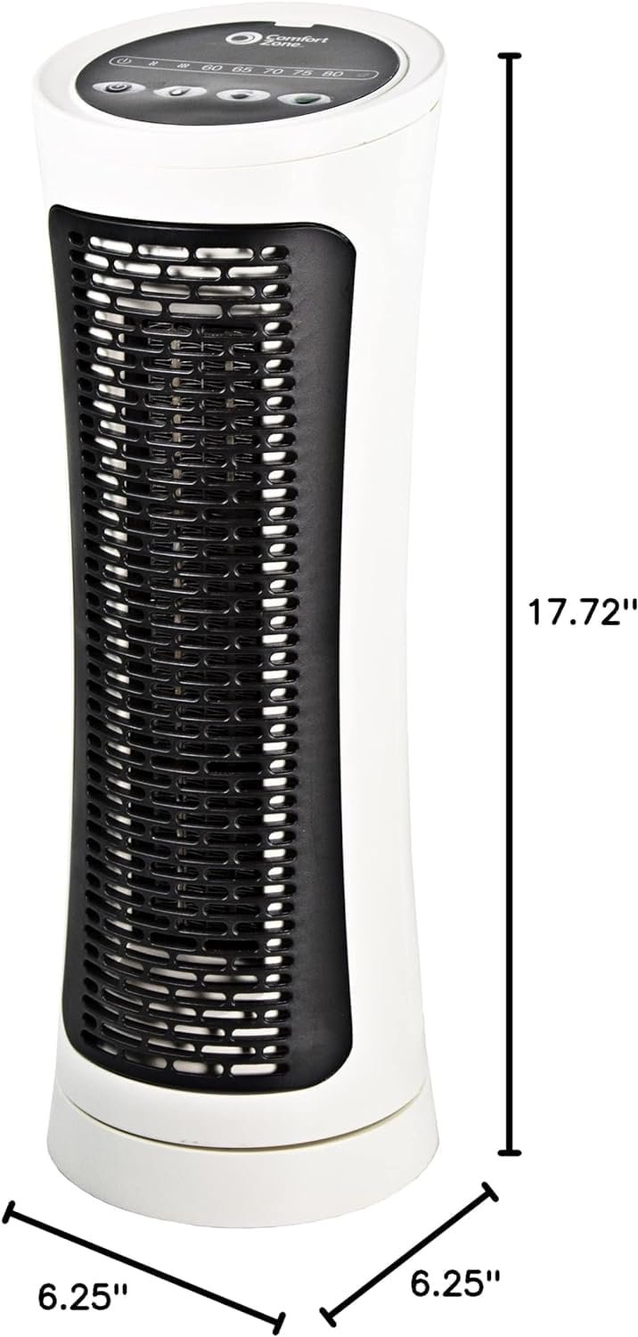 Comfortably heat up rooms in your home with this Energy Save Comfort Zone portable mini tower. With its powerful ceramic heating elements and 2 heat settings, this mini tower heater will keep your room the ideal temperature for your needs. There’s also a fan-only setting, so you can keep your room comfortable in all seasons. Featuring new Energy Save Technology, this portable heater helps save you energy and reduces heating costs, while on the energy save setting. This new setting works to maintain a comfortable temperature in your space, using 30% less energy than a typical heater. Rather than raise the heat throughout your home, simply use this energy-efficient ceramic tower heater in the room that you are in and save on overall heating costs. Recommended for use in medium-sized rooms, this tower heater features a wide, 80-degree oscillation range, distributing heat evenly throughout the room for maximum comfort. This tower heater comes equipped with an advanced safety system that includes an overheat protection sensor that prevents it from getting too hot, a stay-cool body with molded handle and a safety tip-over switch that cuts power if your heater is accidentally knocked over. With its compact size and molded handle, it’s easy to carry from room to room, wherever extra heat is needed.