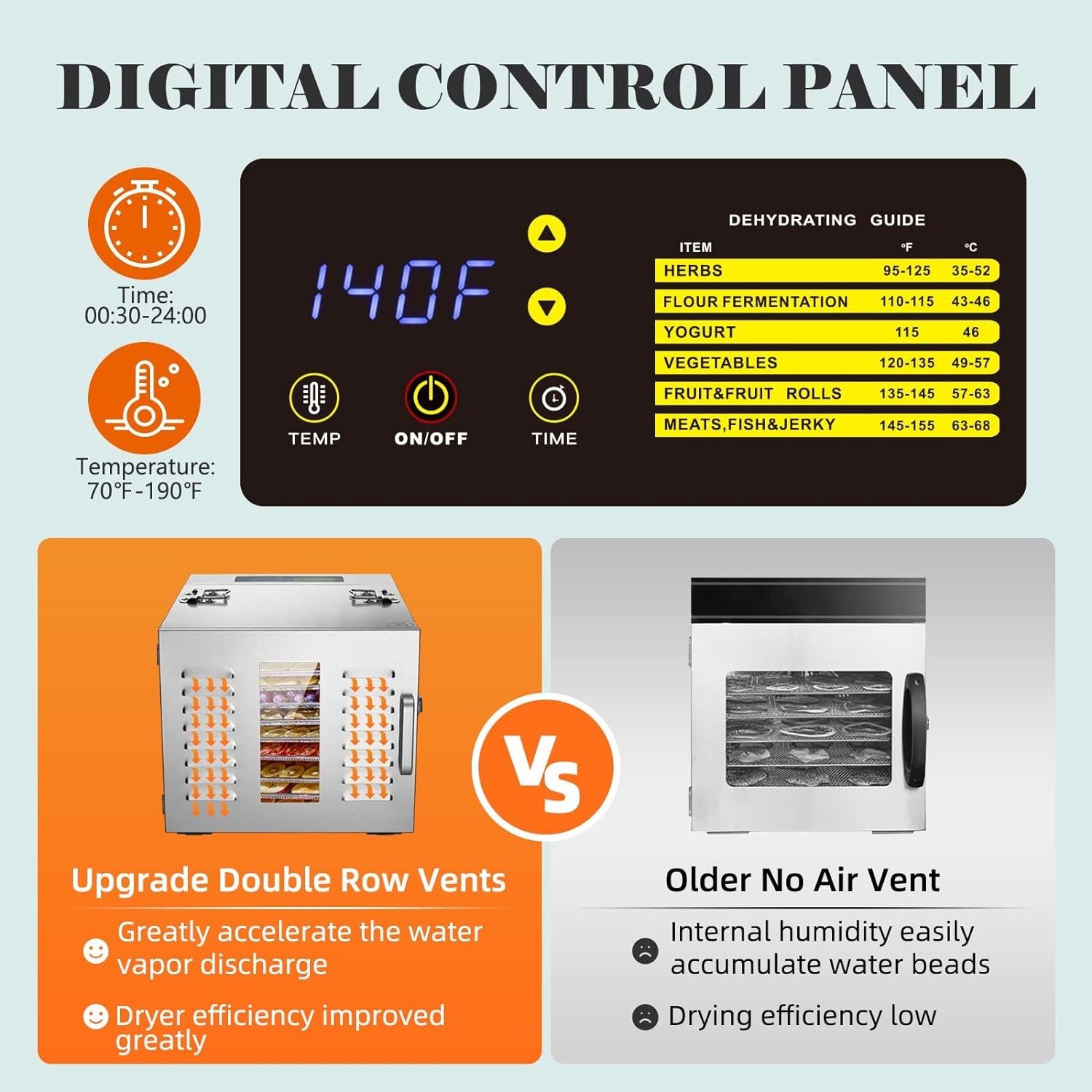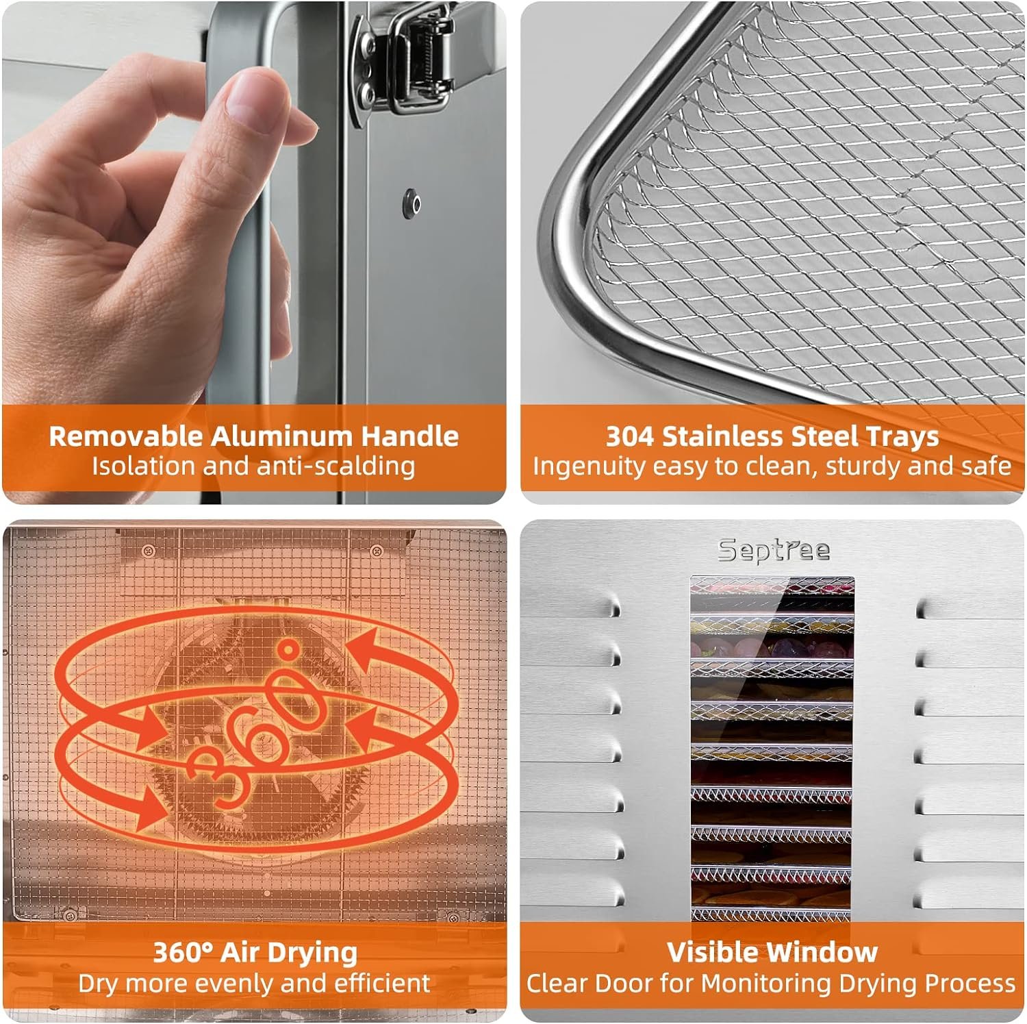 【Large Capacity & Abundant Accessories】Our dehydrators for food and jerky with 10 healthy and durable food grade 304 stainless steel trays (15.6*15.6in), the dehydrator provides 17 square feet to dry vegetables, fruits, herbs, meat, fish, and various kinds of food and lock the minerals and vitamins in the food easily. Our Dehydrator with 10 stainless steel drying trays, 2 non-stick silicone sheets, 1 drip tray, a pair of silicone gloves, 2 storage containers, 1 user manual and 1 recipe book.